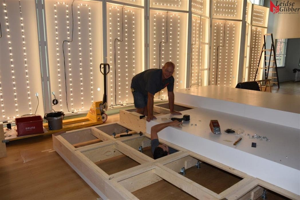 De medewerkers van Bruns, een van de meest toonaangevende musea- en tentoonstellings-inrichters, zijn druk bezig de verschillende afdelingen in te richten.
