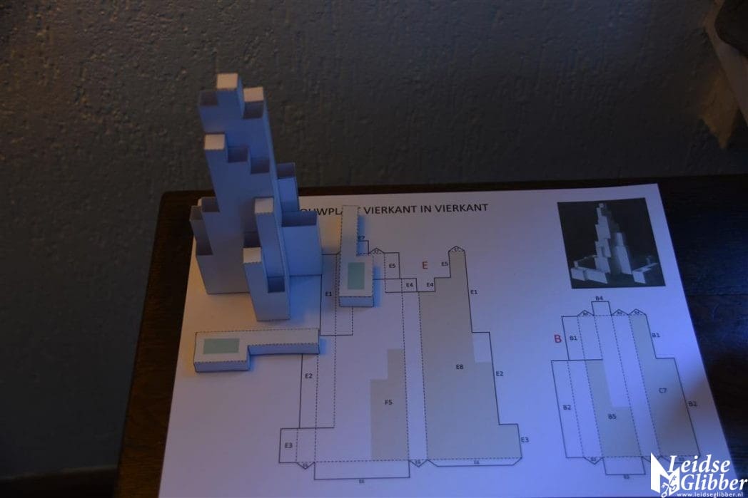 Thuis bij Pink en Peter stond er een stille hint dat ik op moest schieten. Terwijl ik gezellig stond te praten, viel mijn oog op een bouwplaat van Vierkant in Vierkant, het kunstwerk van Theo van Doesburg. Ik keek op mijn horloge en dacht ik moet er vandoor over een uurtje wordt Vierkant in Vierkant officieel aan de stad Leiden overgedragen.