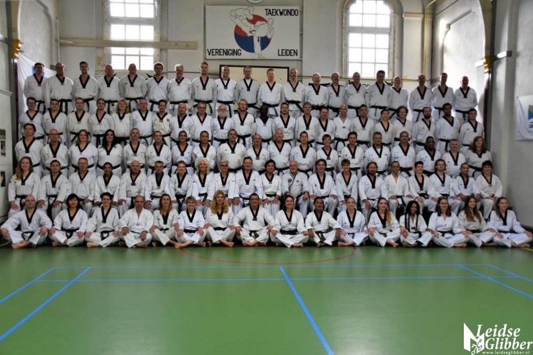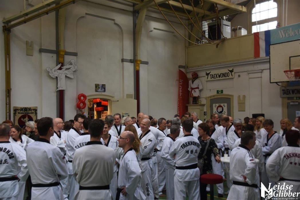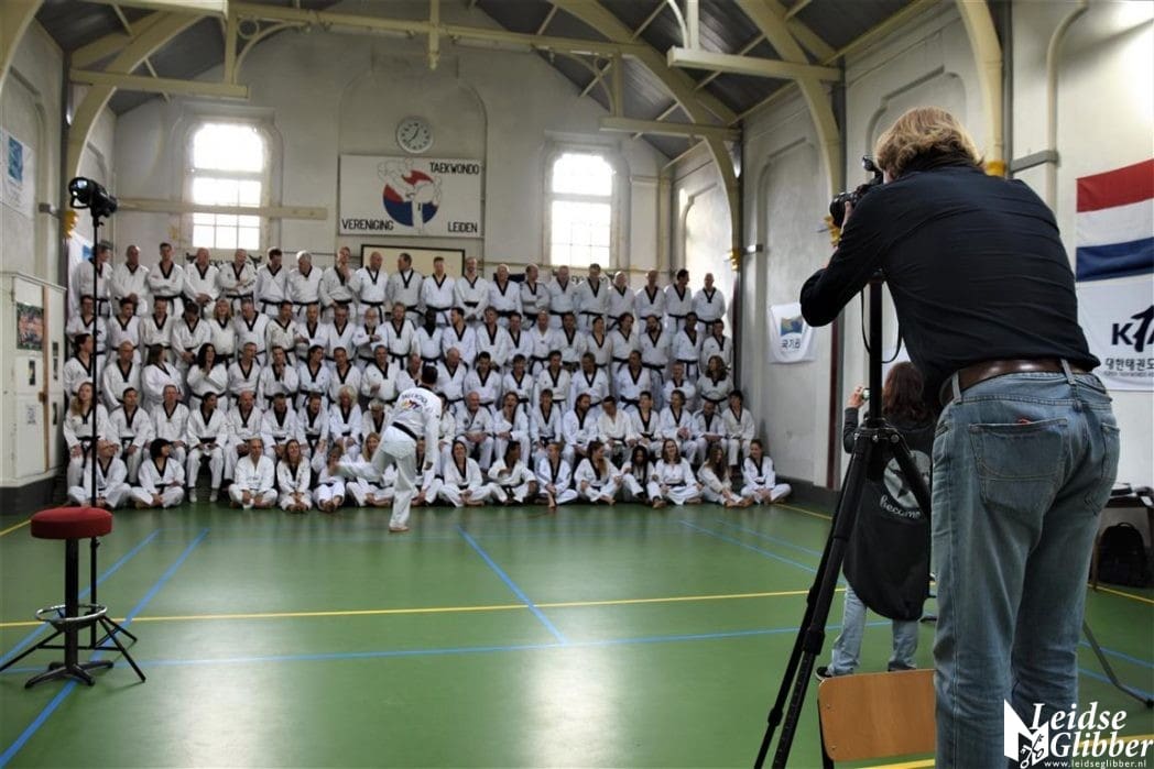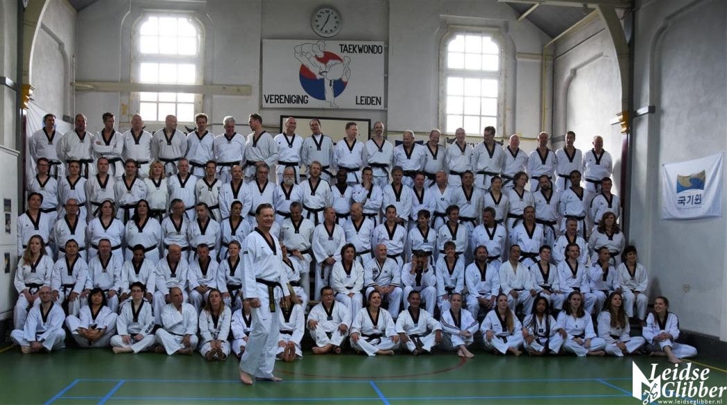 De 40e verjaardag begon zaterdag met een groepsfoto in de sportschool van Gerard. Ruim 100 leerlingen, allen dragers van de zwarte Dan, trainers en oud leerlingen waren naar Leiden gekomen om deze dag mee te vieren met hun meester die samen met Jafar Zareei als enige Nederlanders een 8e Dan Teakwondo hebben.