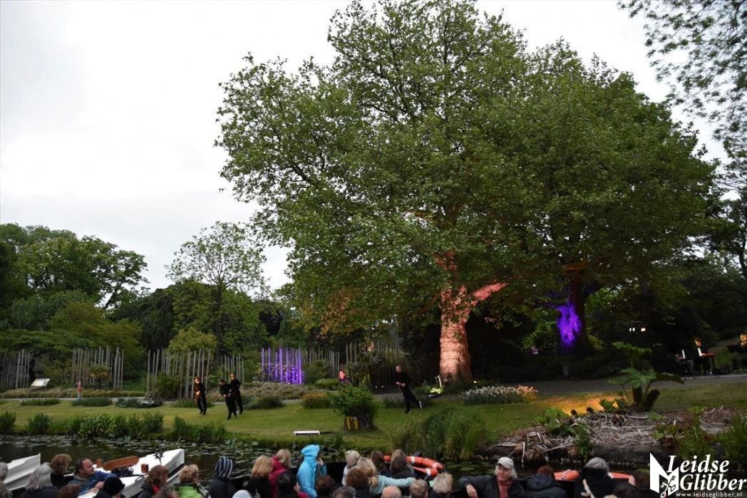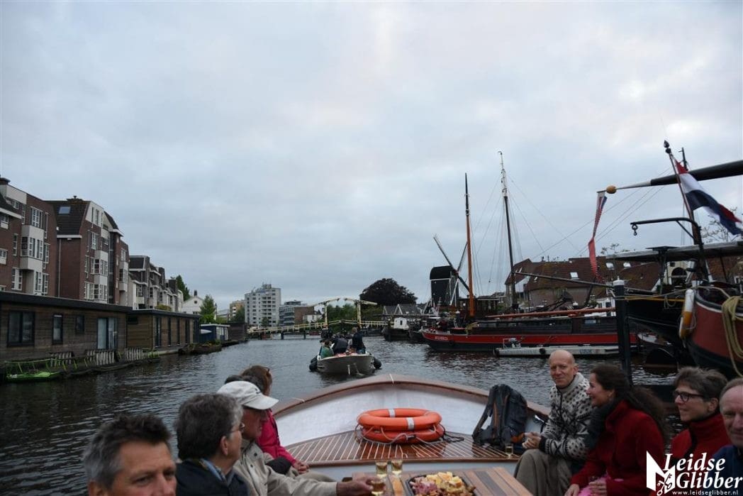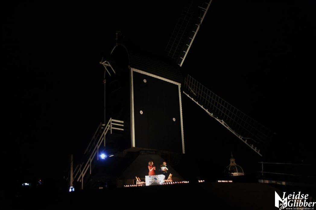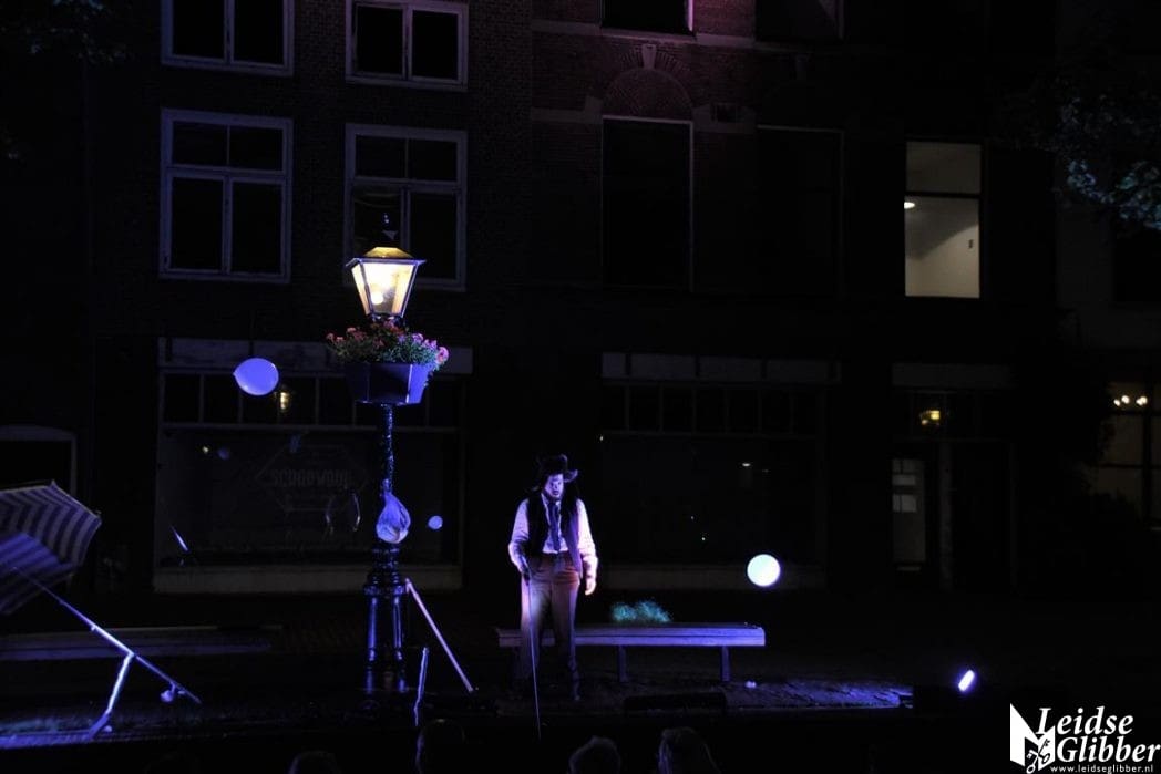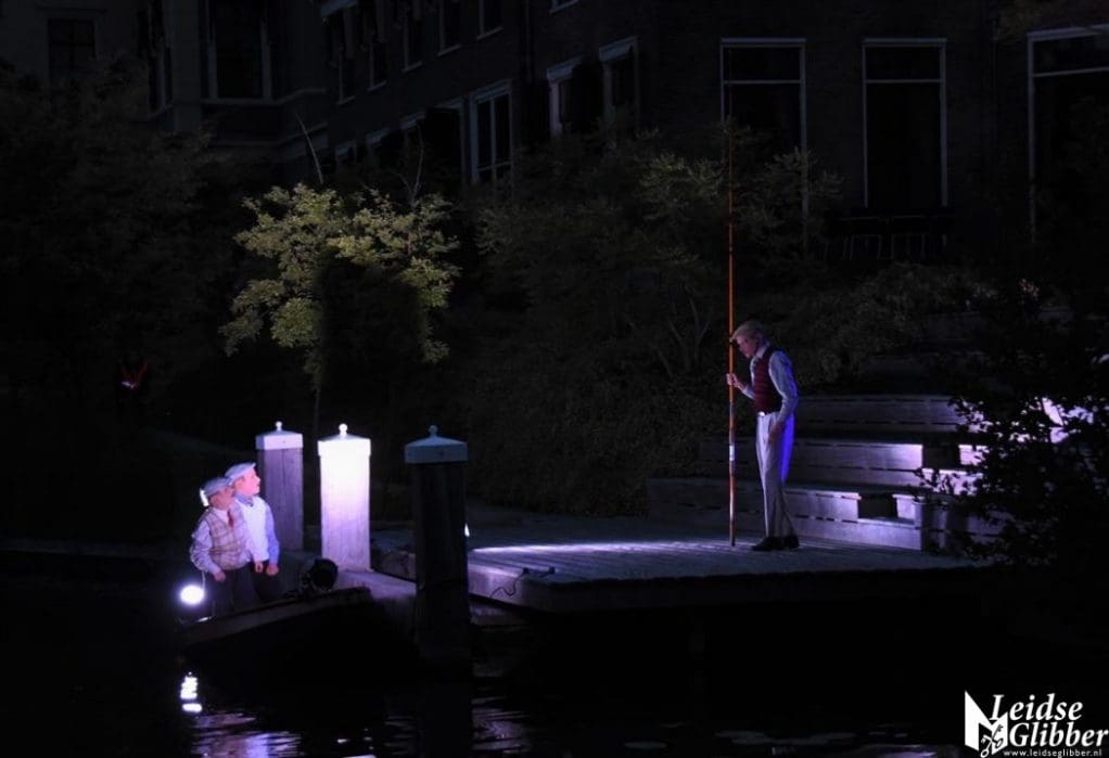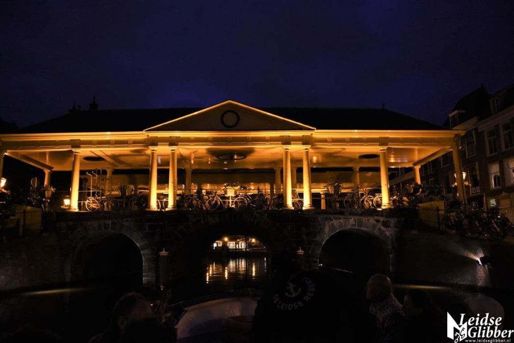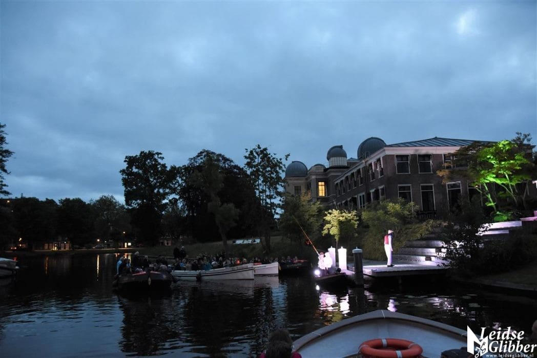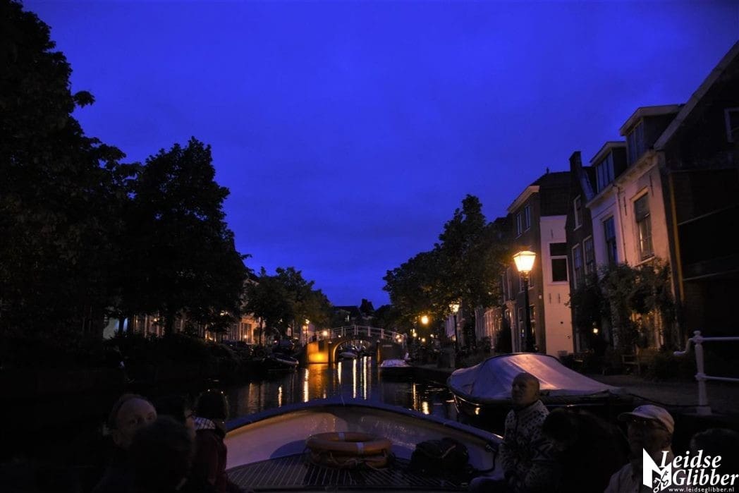 Het publiek in onze boot genoot niet alleen van de voorstellingen, maar ook van Leiden in het donker en de uitgebreide toeristische uitleg van de schippers Denis en Herbert.