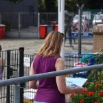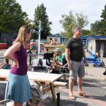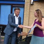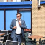 De 100.000ste was ( waarschijnlijk door alweer de hoge temperaturen vandaag) iets eerder dan verwacht dus de wethouder was nog niet aanwezig. Met een kopje koffie wachtte ze even op de wethouder die enkele minuten later aankwam.