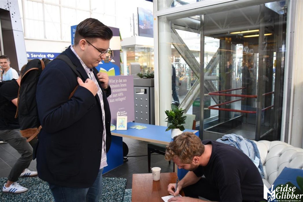 Tim den Besten signeerde zijn ‘Six minutes story’ De Kinderpopster op het station in Leiden