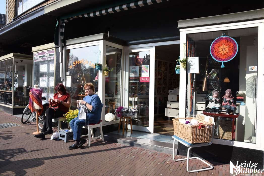 Lekker voor de deur van wolwinkel Steekje Los zitten breien in het zonnetje, dan kan je nog wel eens een steek laten vallen en kom je wol te kort dan loop je even naar binnen 🙂