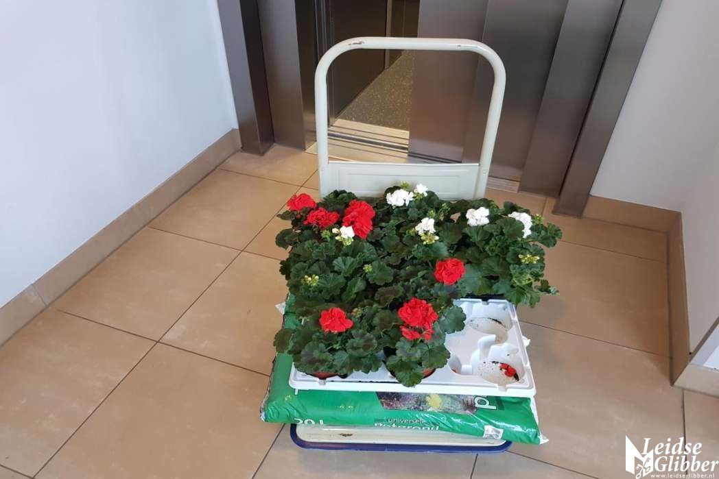 Ik stond dus even later met zakken aarde en bloemen te wachten bij de lift.