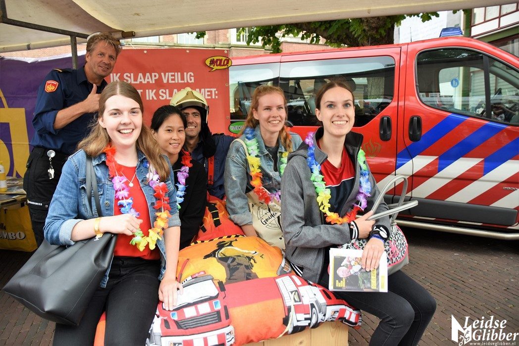 Op de markt staat ook elk jaar een stand van de brandweer om onder andere duidelijk te maken hoe belangrijk rookmelders in studentenhuizen zijn. Iedereen kan, voor de foto, met een van de brandweermannen in bed. Deze meiden waren een beetje schuchter en bleven heel netjes op de rand van het bed zitten.