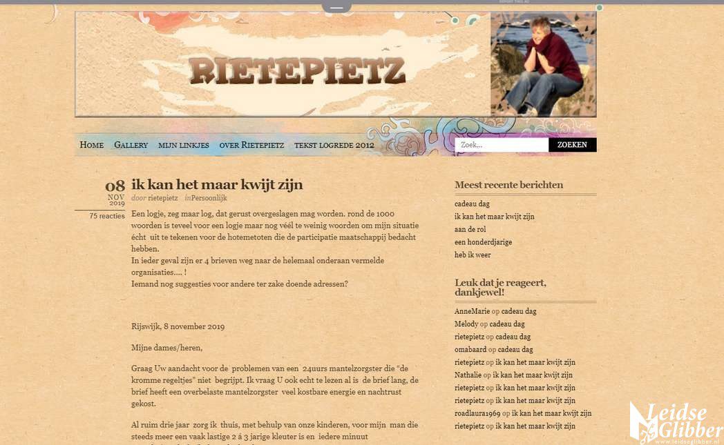 Ik zet nooit artikelen van anderen op mijn site en iedereen die hier al langer leest weet dat de bedoeling van mijn site juist is om positief en leuk nieuws te brengen en dan voornamelijk uit Leiden. Vandaag maak ik een uitzondering omdat ik met bewondering en vaak verbazing de blogs van de 77 jarige Rietepietz uit Rijswijk lees over hoe zij omgaat met haar 83 jarige dementerende man. Even eerst een beetje uitleg. Ik ken Rietepietz al vanaf het moment dat ik begon met bloggen en genoot van haar heerlijke humor en schrijfstijl, maar had geen idee wie er achter de blogs zat. Ik leerde haar pas in 2006 in het echt kennen tijdens een weblogmeeting die ik in Leiden georganiseerd had, waar een stuk of 10 bloggers uit het hele land op af kwamen. Pas toen begreep ik dat er achter die geweldige blogs een 60 plusser zat.