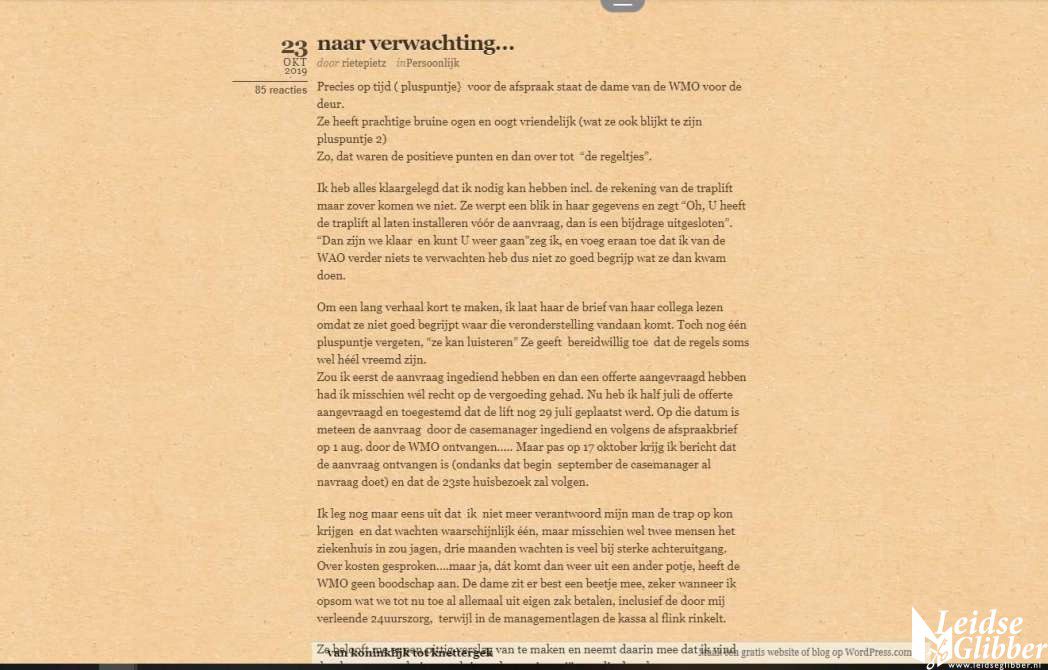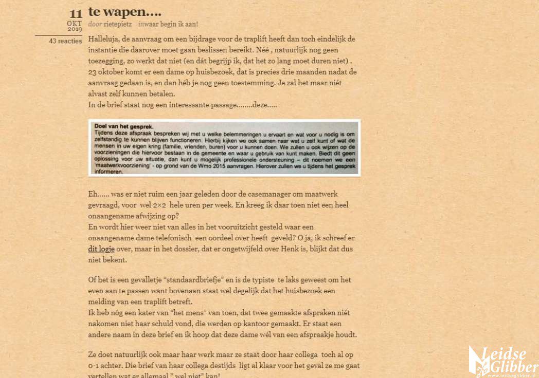 Er moest snel iets gebeuren en Rietepietz scharrelde haar spaarcentjes bij elkaar en liet een traplift komen en deed ook direct een aanvraag omdat dit toch wel en behoorlijke uitgave was. Er moest gewoon heel snel iets gebeuren. Begin oktober kwam kwam er een brief dat de mevrouw van de gemeente al over de traplift kwam praten.