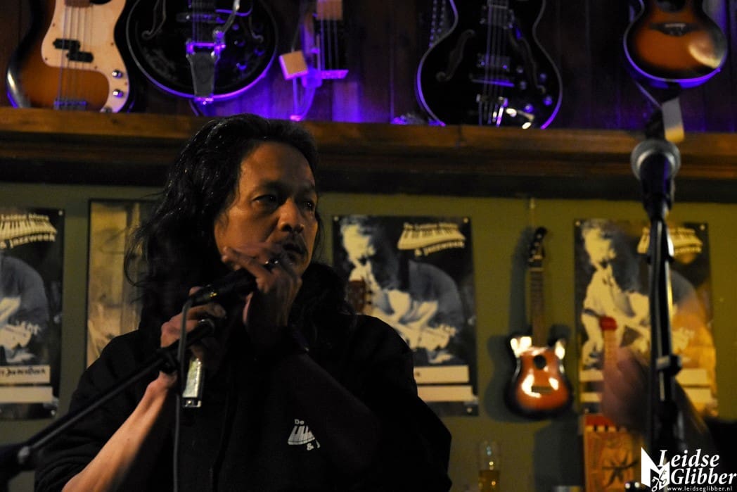 Flo heeft altijd een kistje mondharmonica’s bij zich en als de gelegenheid zich voordoet blaast hij graag een nummertje mee.