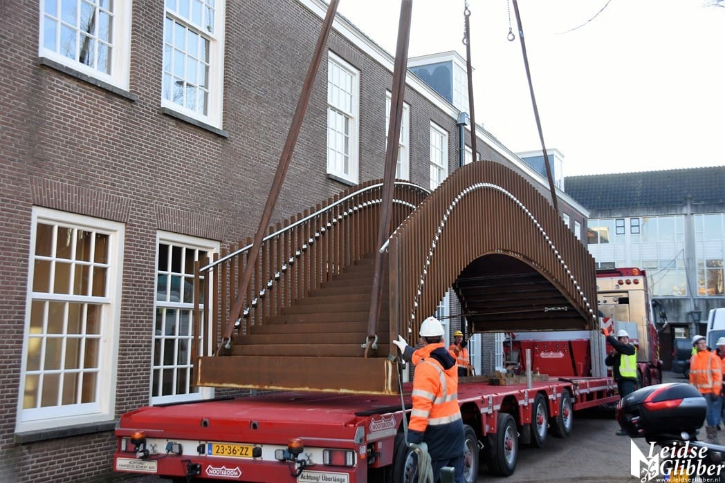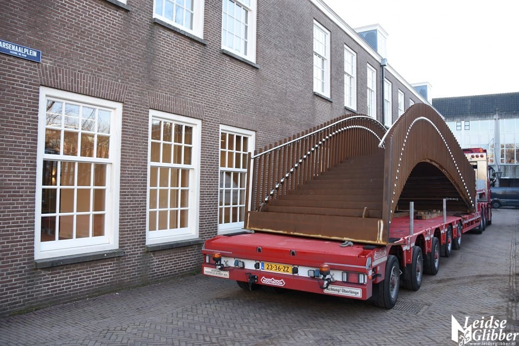 Op een dieplader was de brug aangekomen bij het Arsenaalplein om met een hijskraan op zijn plek gehesen te worden.