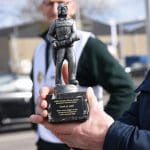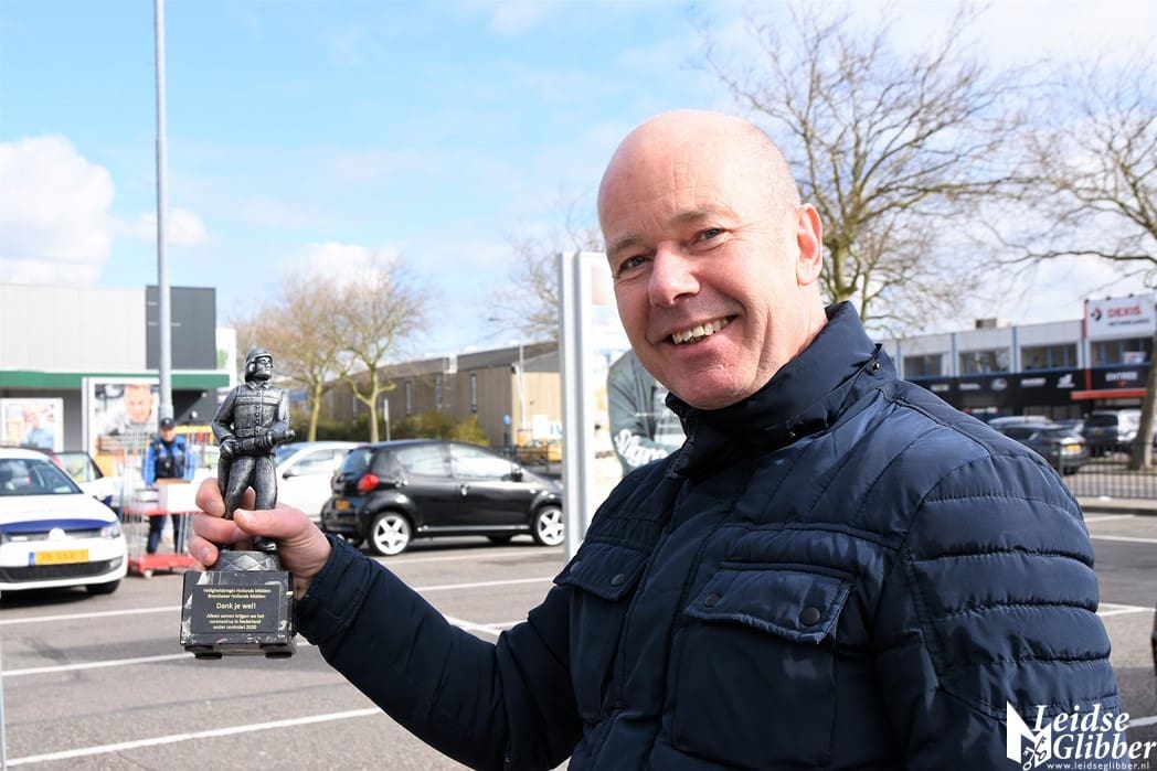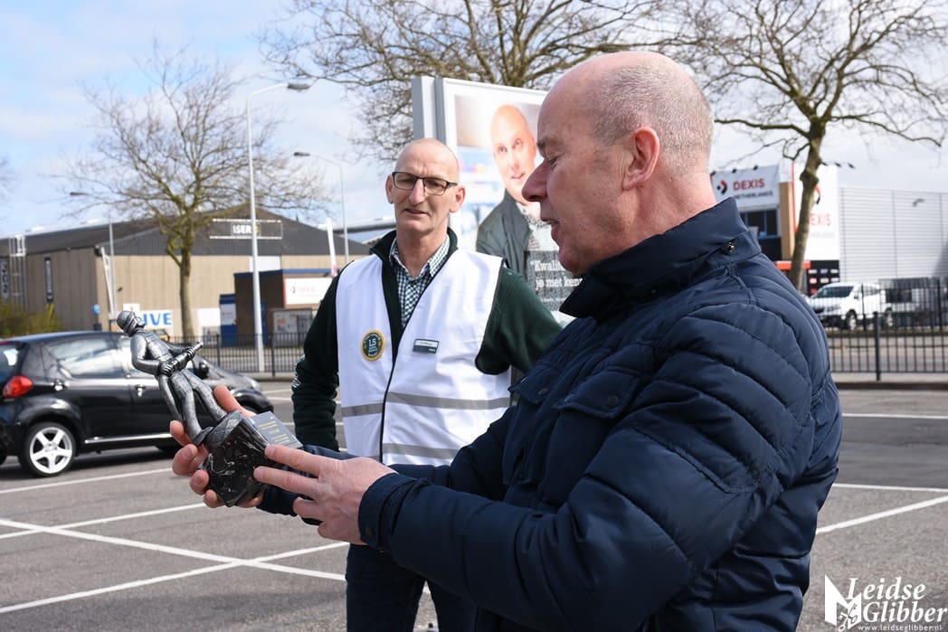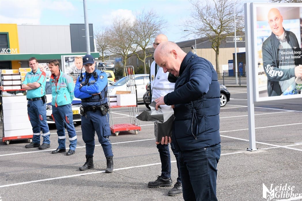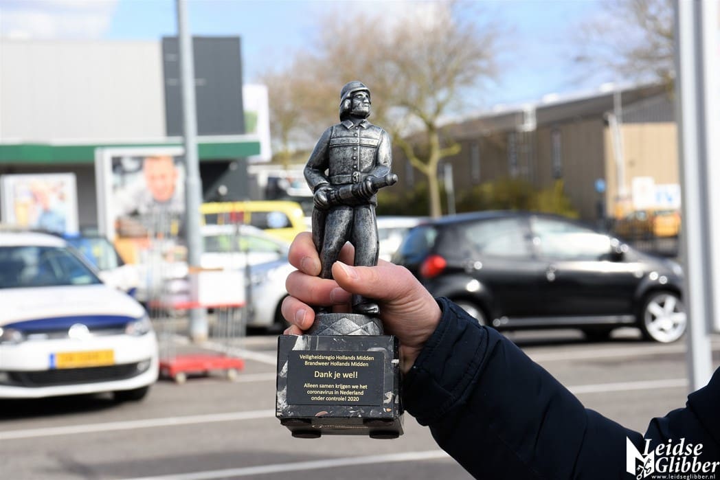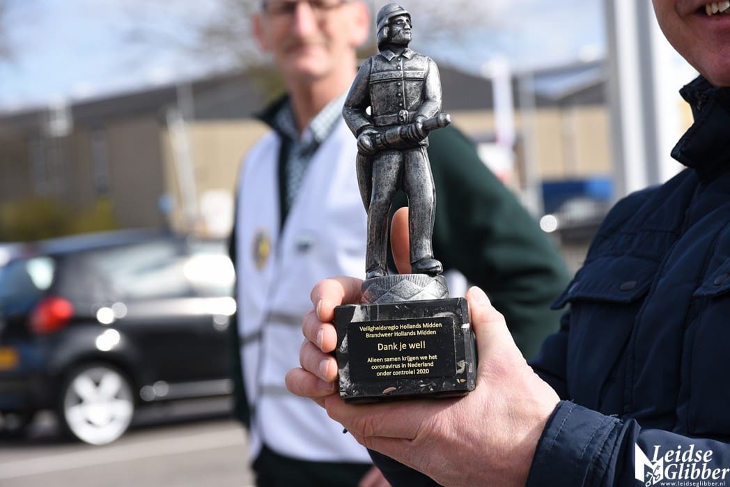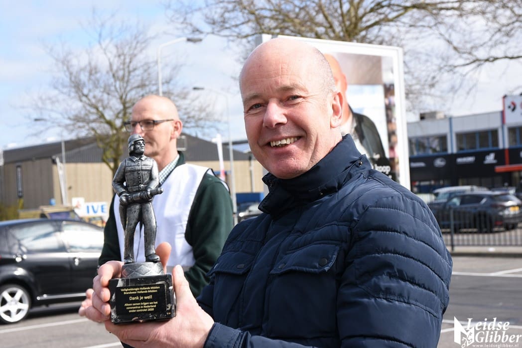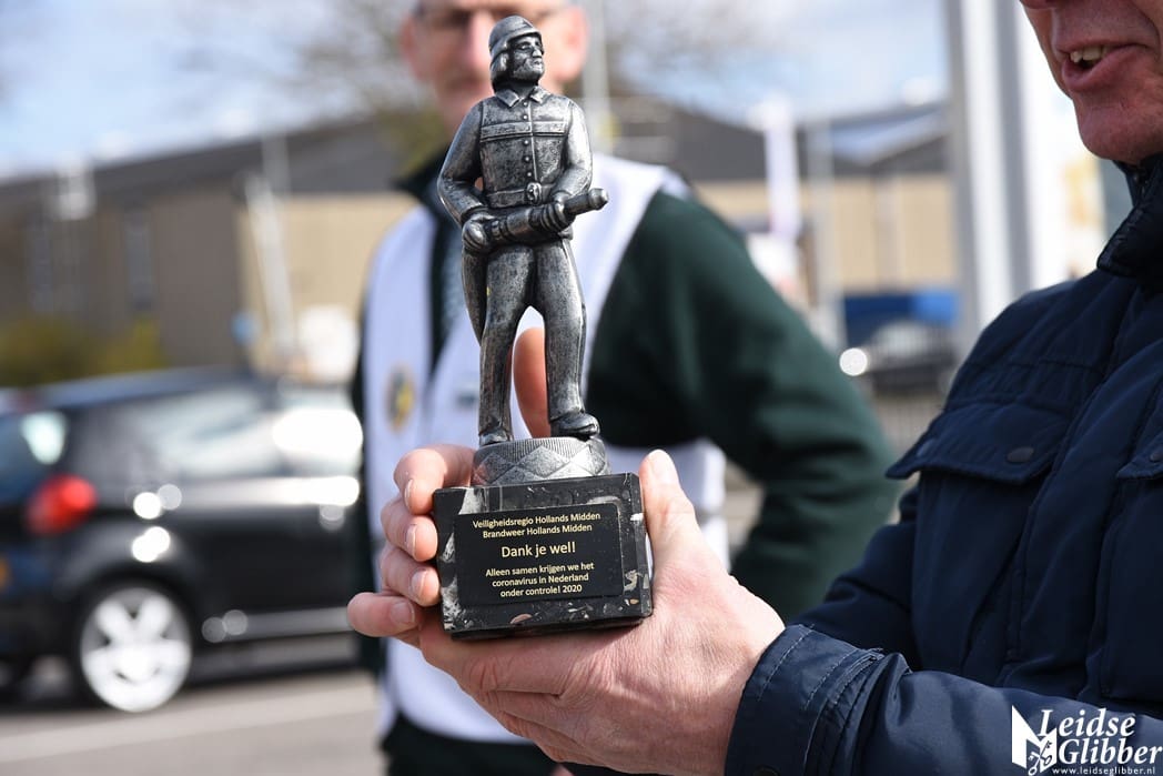 Omdat een en ander maandag al afgesproken was, had Arthur Haasbroek namens de brandweer Hollands Midden een passend cadeautje voor Arno en zijn medewerkers meegenomen.