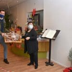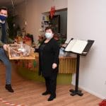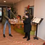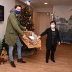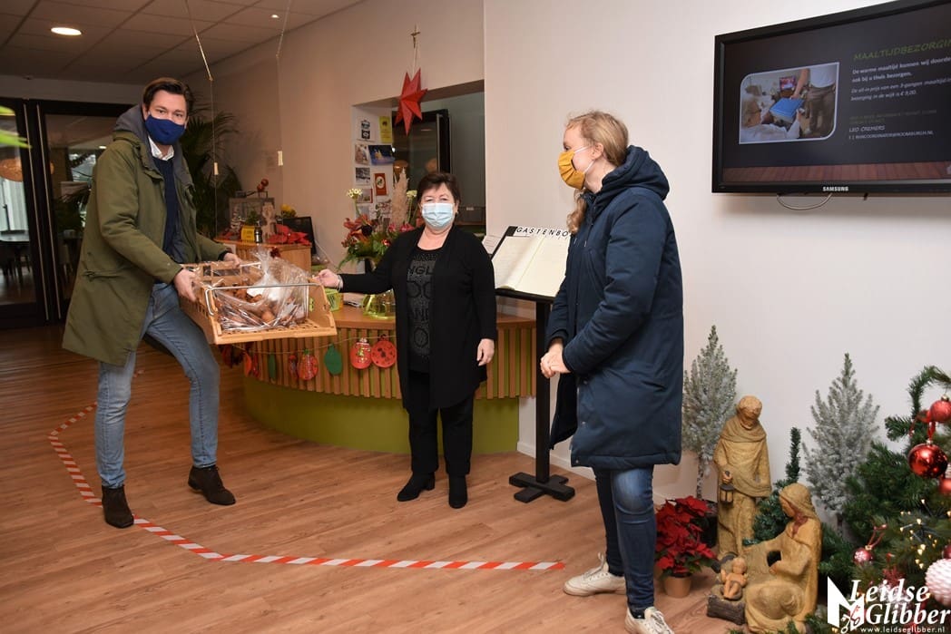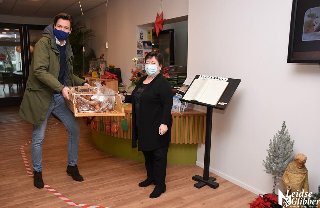 Vanwege corona konden ze dit jaar niet de oliebollen zelf uitdelen aan de bewoners, dus werd de mand overhandigd aan Mieke  Sierat.