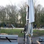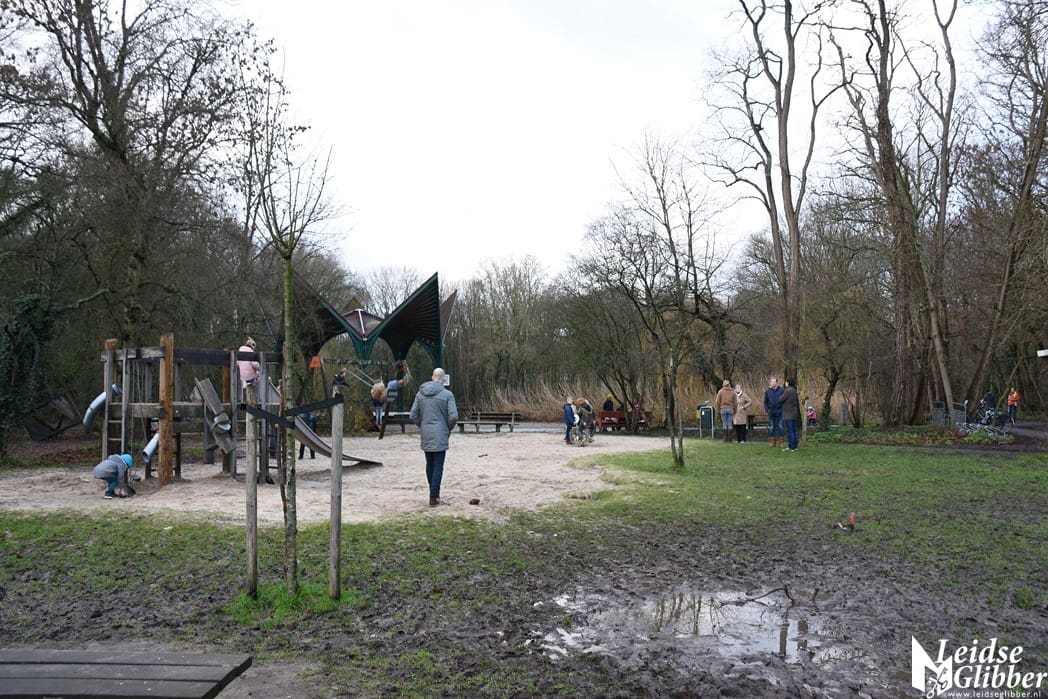 Her en der rondom de speelplek stonden groepjes mensen keurig op ruime afstand van elkaar te kletsen.