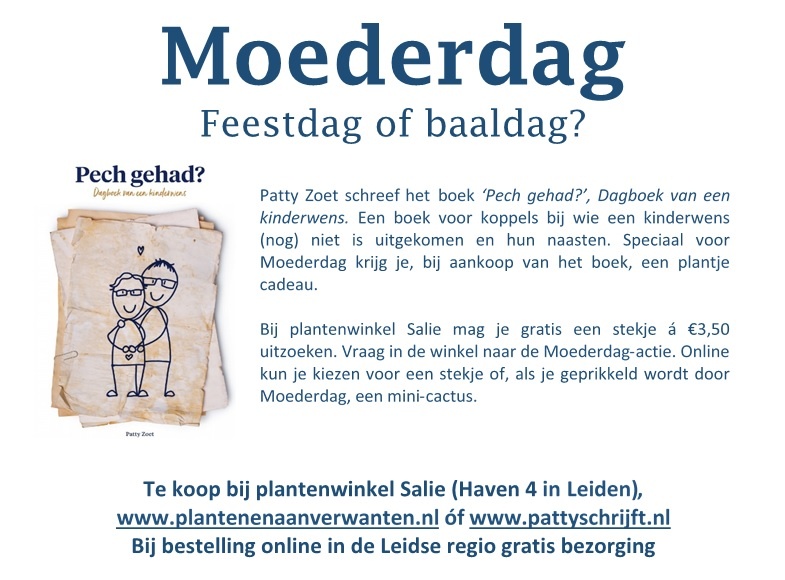 Komende zondag is het Moederdag, een dag met twee gezichten. Vele moeders worden die dag verrast met een ontbijtje op bed (niet altijd leuk 🙂 ) een kindertekening, een cadeautje of een plantje. Voor veel vrouwen is het ook een zware dag. Vrouwen met een nog niet ingeloste kinderwens, of vrouwen die echt geen kinderen kunnen krijgen hebben het moeilijk met die dag. Wekenlang worden ze geconfronteerd met reclames over moederdaggeschenken en verhalen hoe leuk het is dat die kinderen er zoveel werk van maken. Dan voelt een plantje al snel als een cactus. Patty Zoet schreef het boek ‘Pech gehad ?’ over haar niet ingeloste kinderwens.