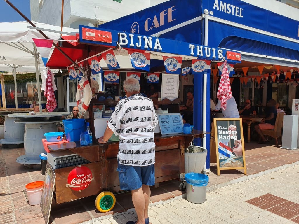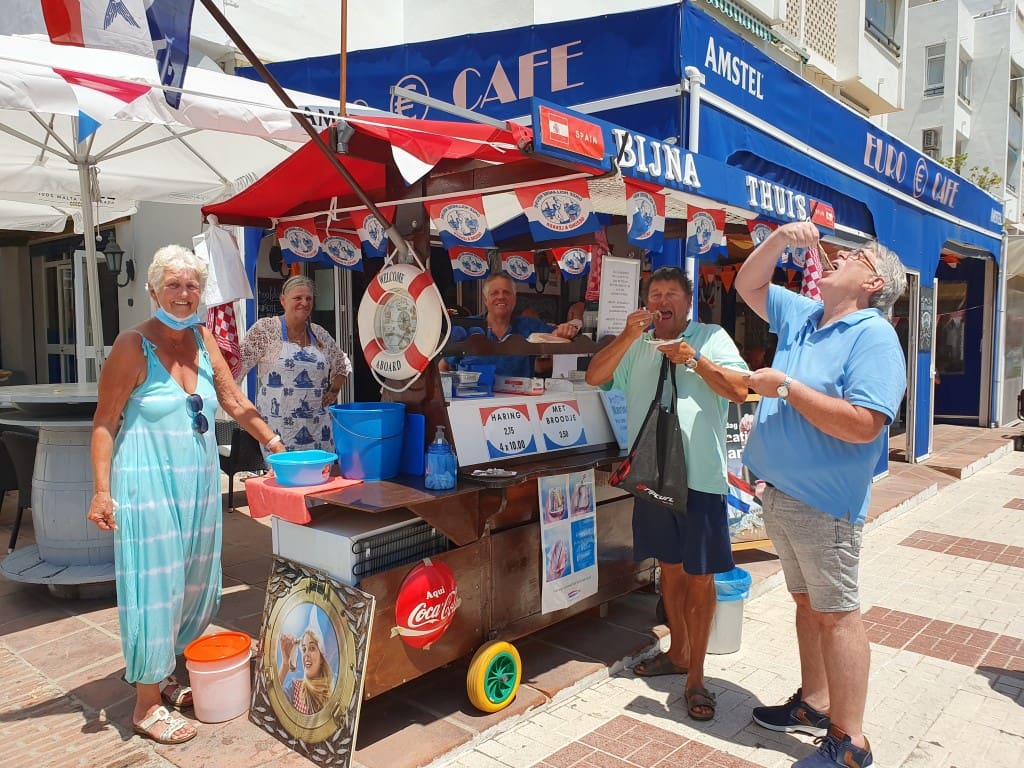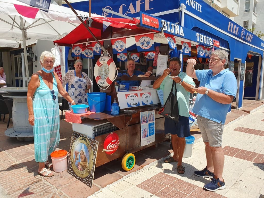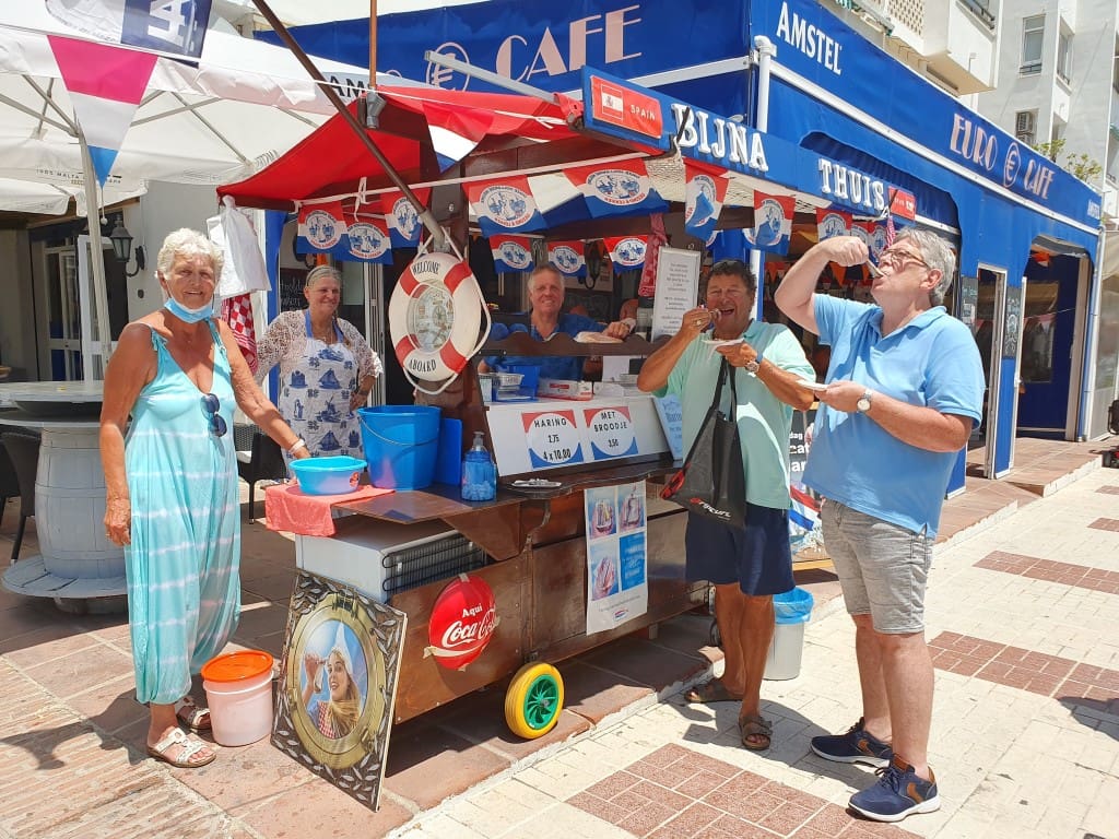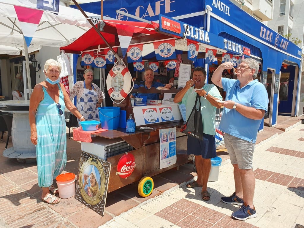 Zonde hoor geen haringparty’s dit jaar, nieuwe haring is en blijft behalve lekker ook iets feestelijks. Om dan toch maar een feestje te hebben met de nieuwe haring ben ik maar even naar La Carihuela gegaan waar Vlaardinger John Hofman en zijn Katwijkse vrouw Els al jaren elke vrijdag en zaterdag met zijn haringkar voor de Eurobar staat. Vandaag was er de eerste nieuwe haring en stond hij er uiteraard ook.