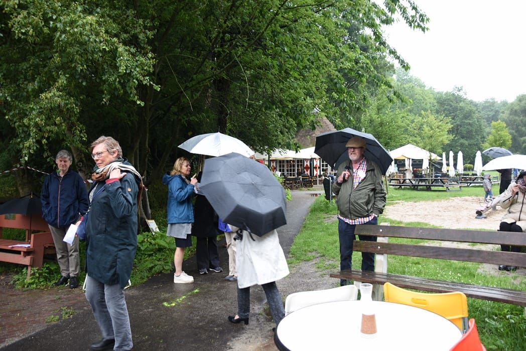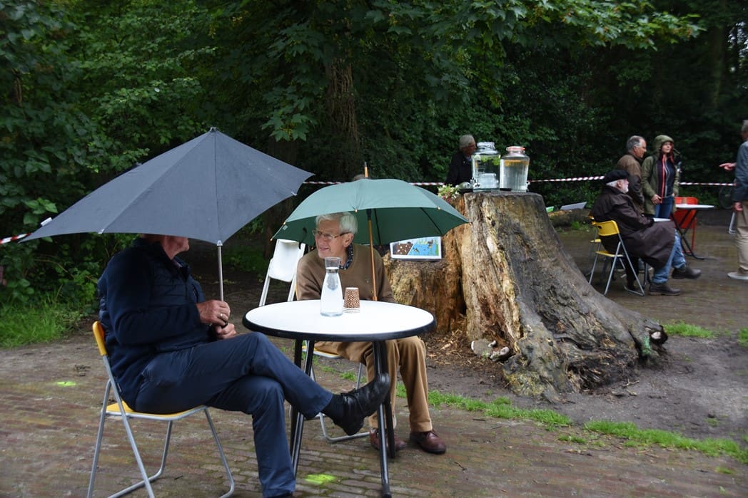 In de stromende regen in een park gaan zitten doe je niet zomaar, dan moet er iets bijzonders aan de hand zijn. Het was opmerkelijk dat ondanks de stromende regen vrijwel alle genodigden voor de viering van 90 jaar Volkspark De Leidse Hout aanwezig waren.