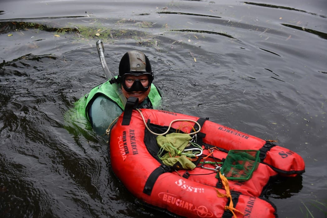 Stadsgrachtenadviseur Aaf Verkade snorkelt niet alleen in de Leidse grachten, ze heeft onlangs ook in de grote vijver gesnorkeld. Er zit veel vis in de vijver, het vuil op de bodem viel mee. Vlak langs de kant wat bierflesjes en een terrasstoel, verder is de vijver goed schoon. Ze waarschuwde er zeker niet in te gaan zwemmen, het zit vol met waterplanten en voor je het weet zit je verstrikt.