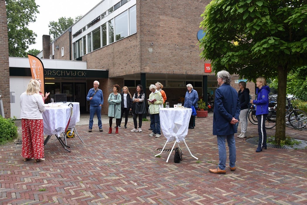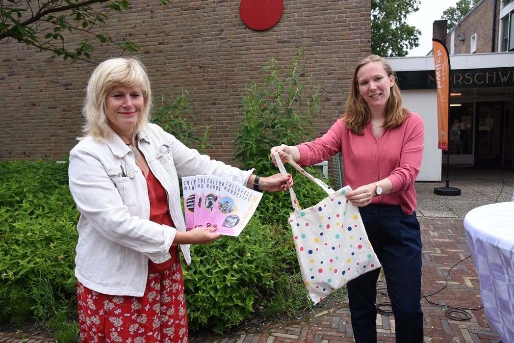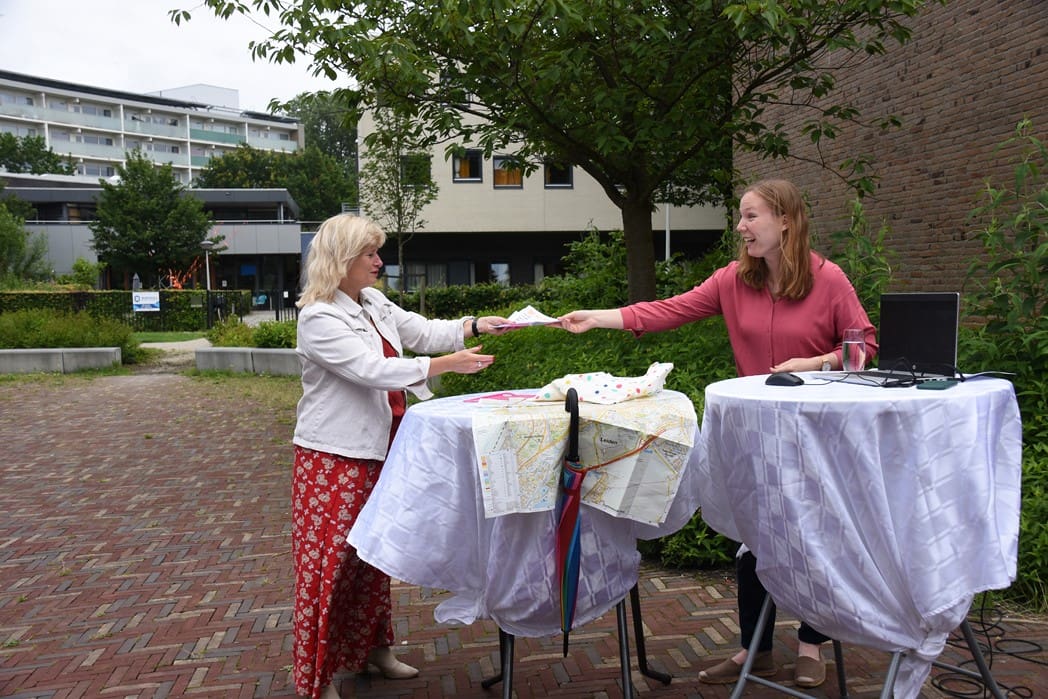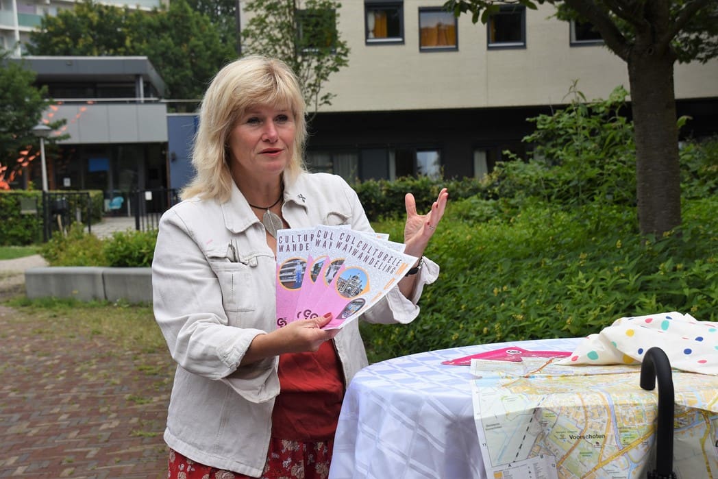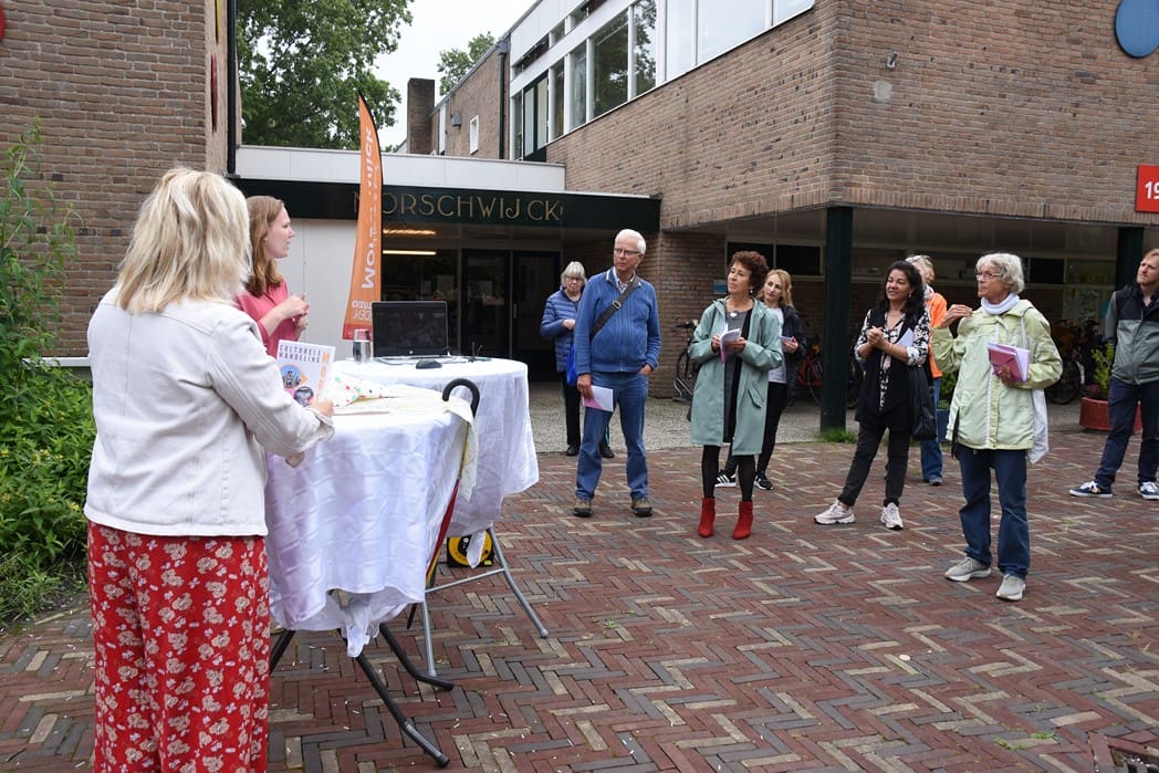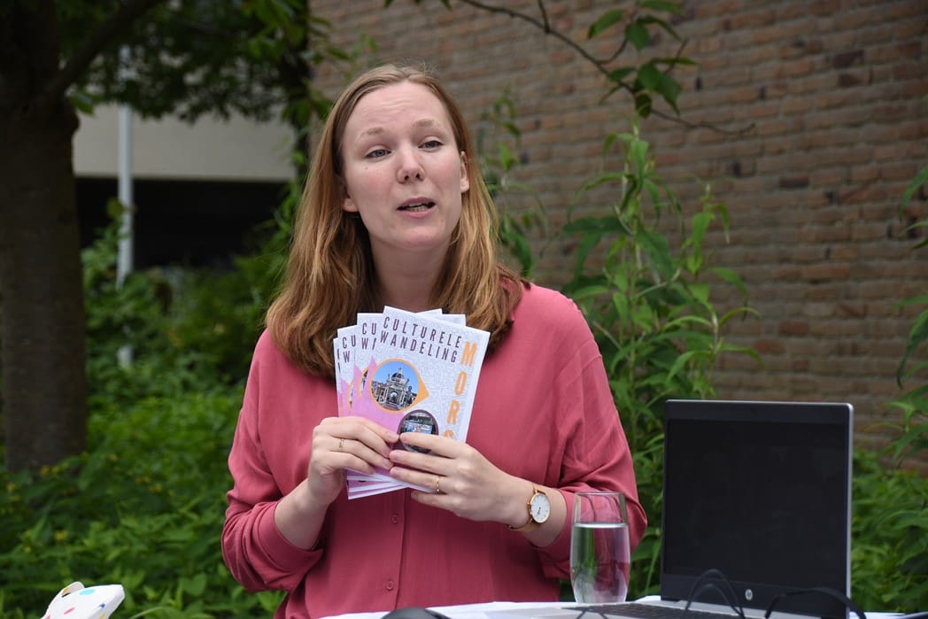 Het eerste exemplaar werd uitgereikt aan wethouder Yvonne van Delft. Voor de uitreiking maakte ze kennis met een paar wandelgidsen van de Morschwijk. Deze gidsen wandelen regelmatig met buurtbewoners door de wijk en omgeving.
