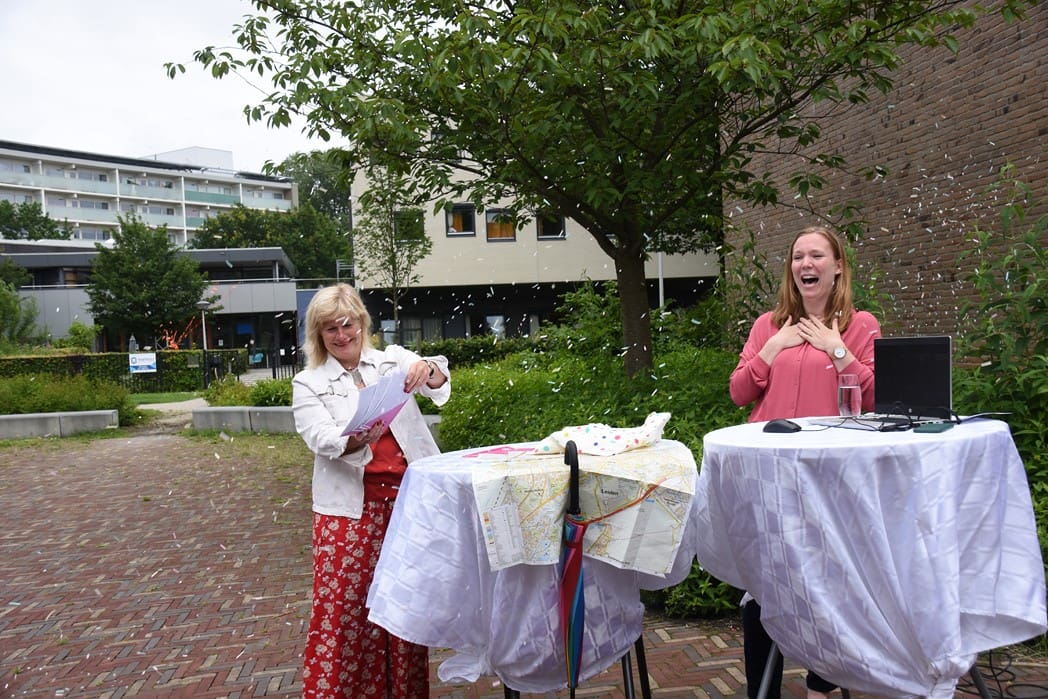 In een regen van confetti nam Yvonne de vier boekjes in ontvangst.