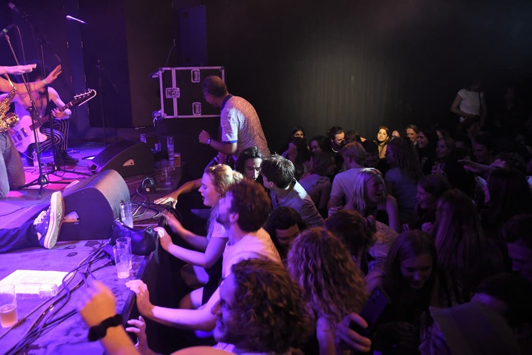 Dat het een feest was is duidelijk, nadat hij zelf al gespeeld had bij de Nachtelijke Escapades kon saxofonist Jochem ( tweede van rechts) het niet laten toch nog even het podium op te komen om spontaan mee te blazen.