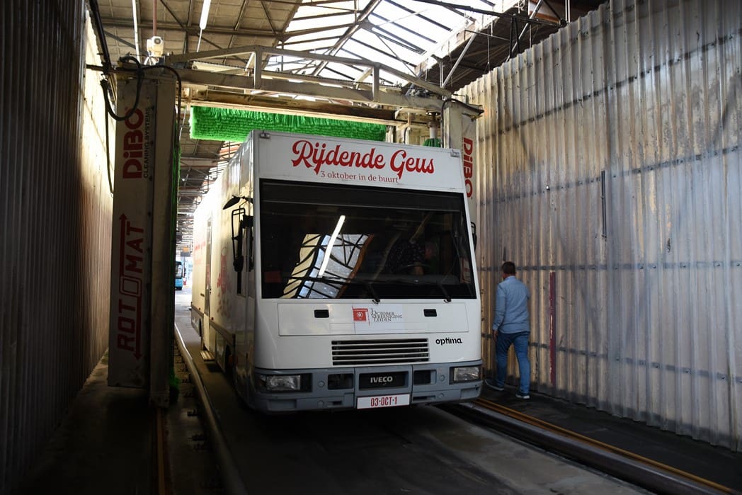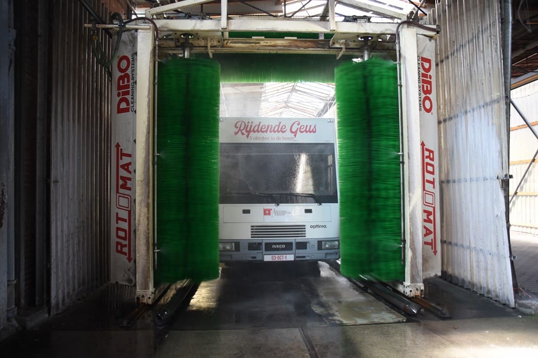 In een paar minuten tijd was de bus de wasstraat door en kwam er weer blinkend schoon uit.