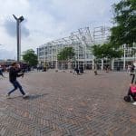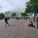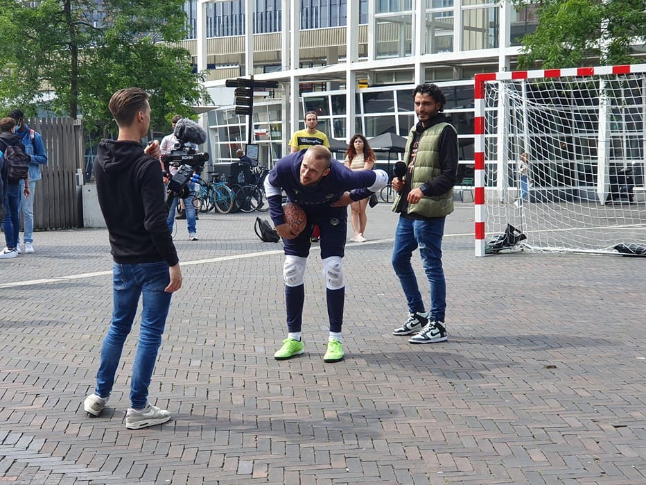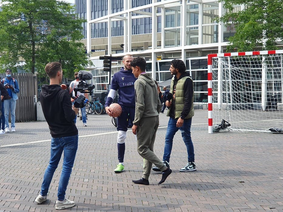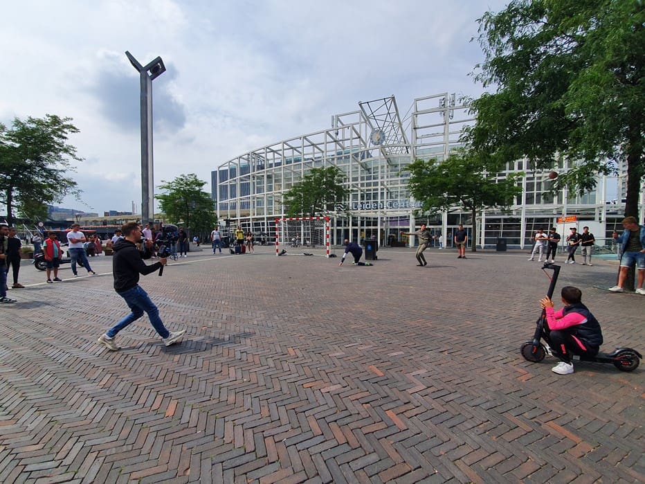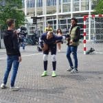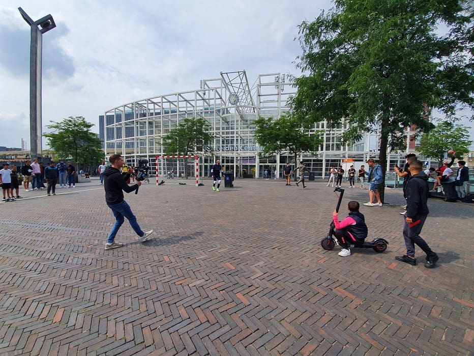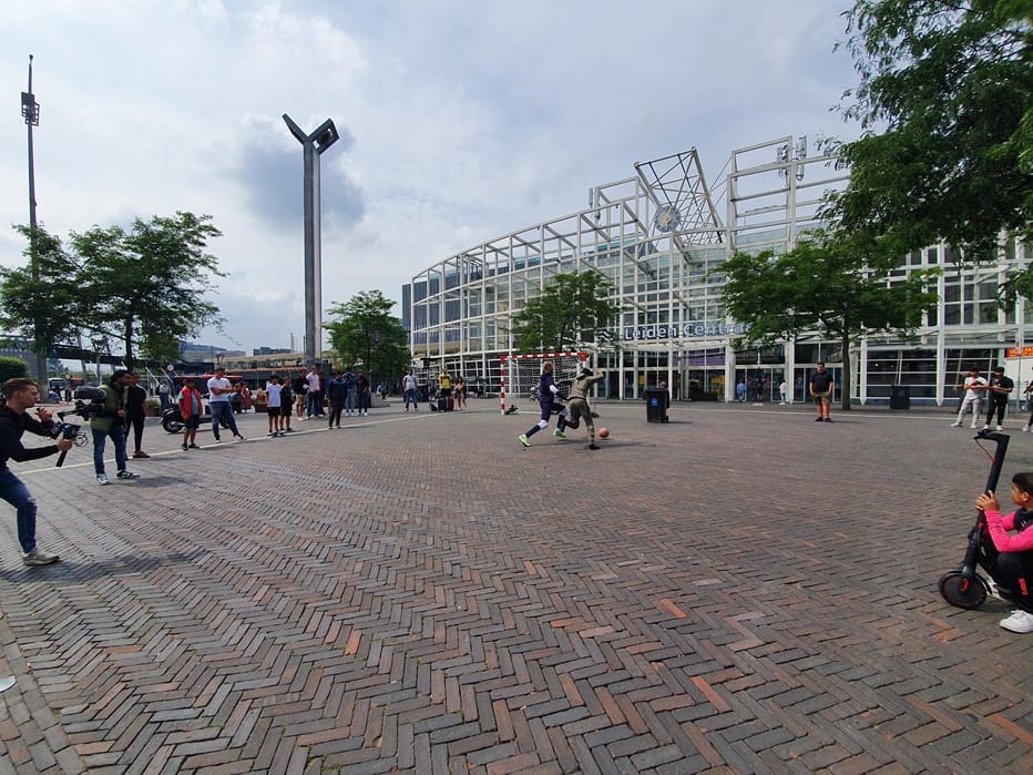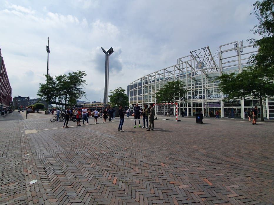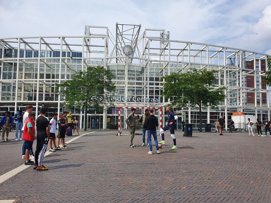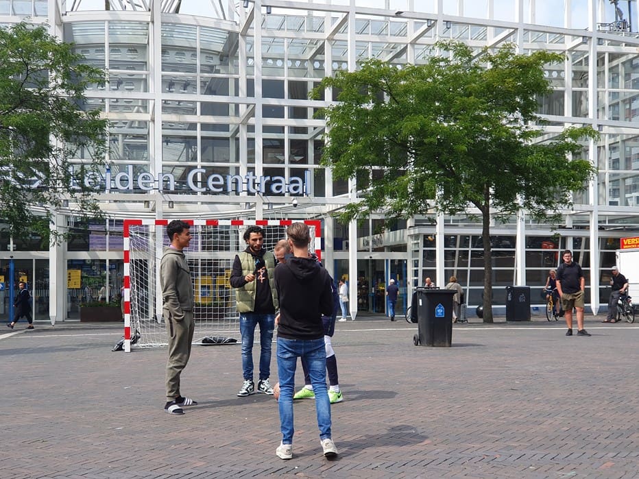Wat doet een voetbalgoal op het Leidse Stationsplein vroegen voorbijgangers zich gisteren af. Freestyle voetballer Soufian Touzani en keeper Koen van der Leeden lieten kinderen een balletje trappen.