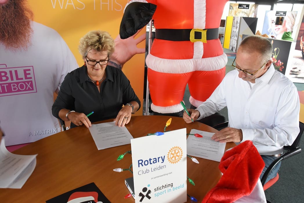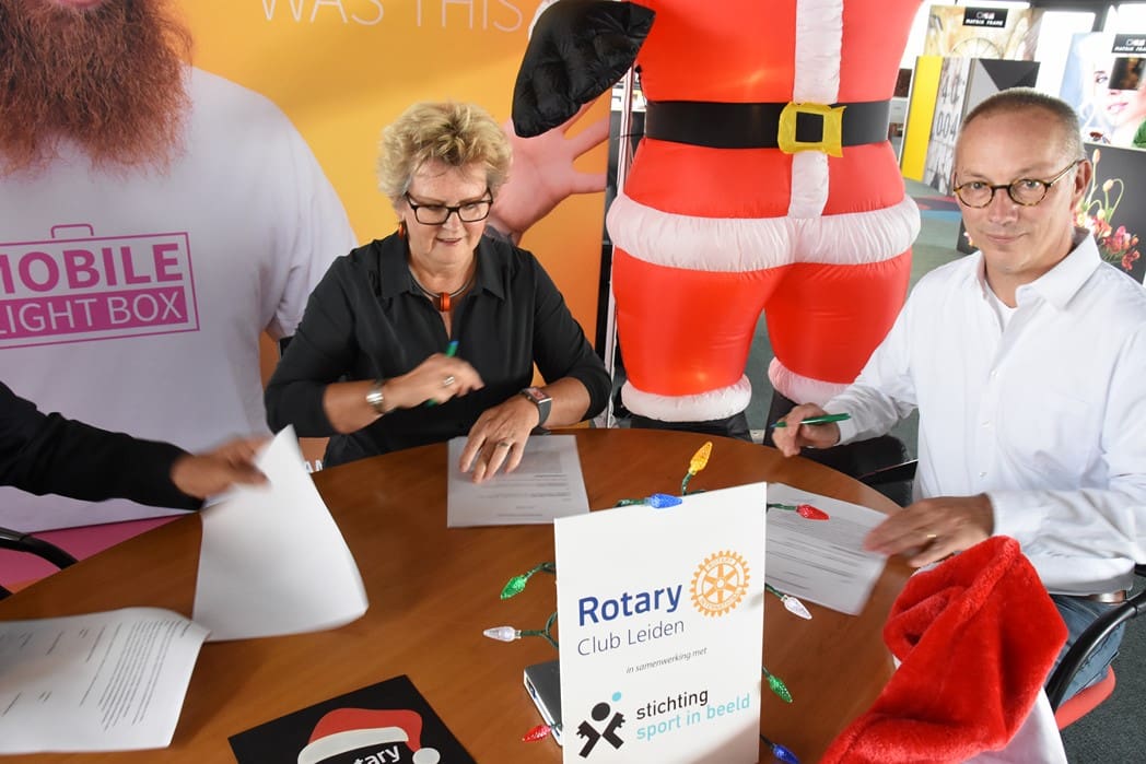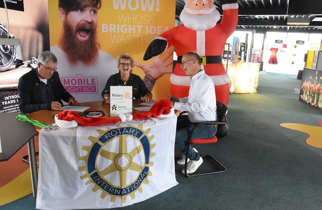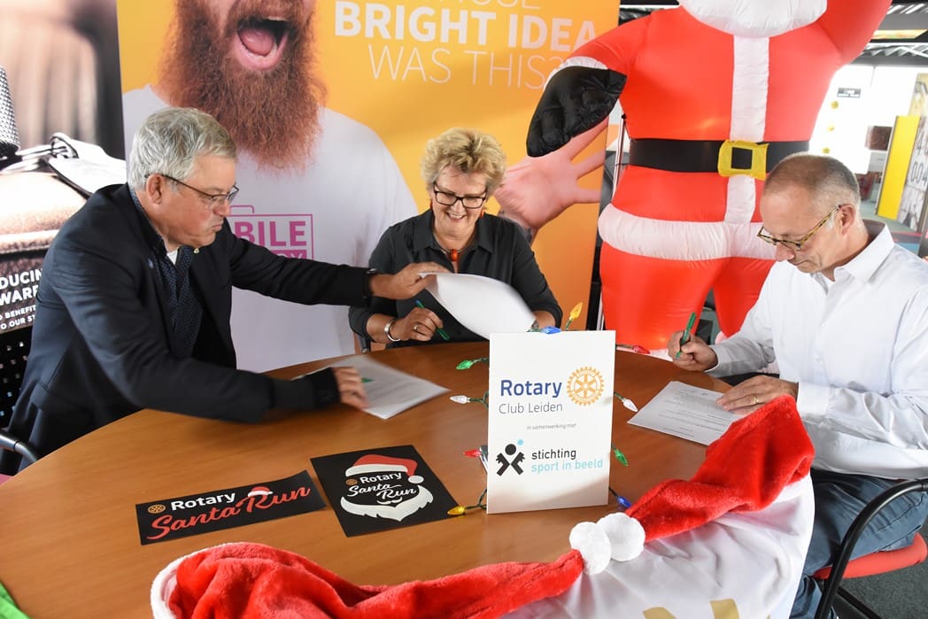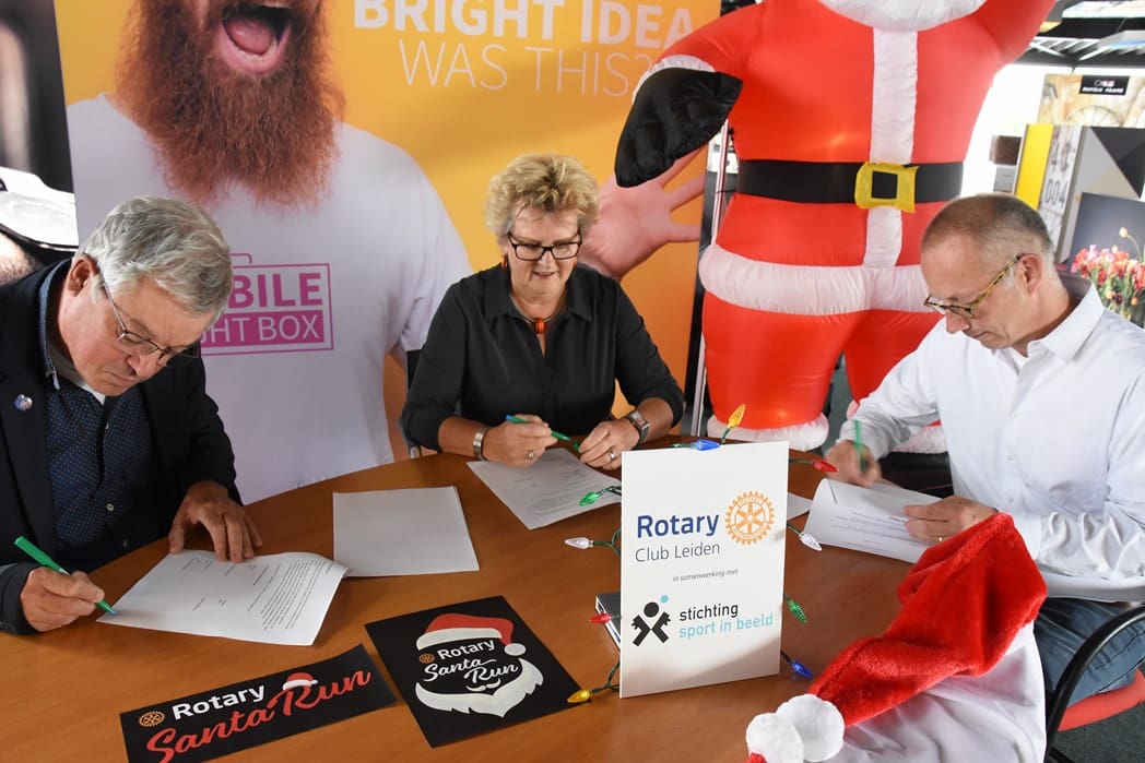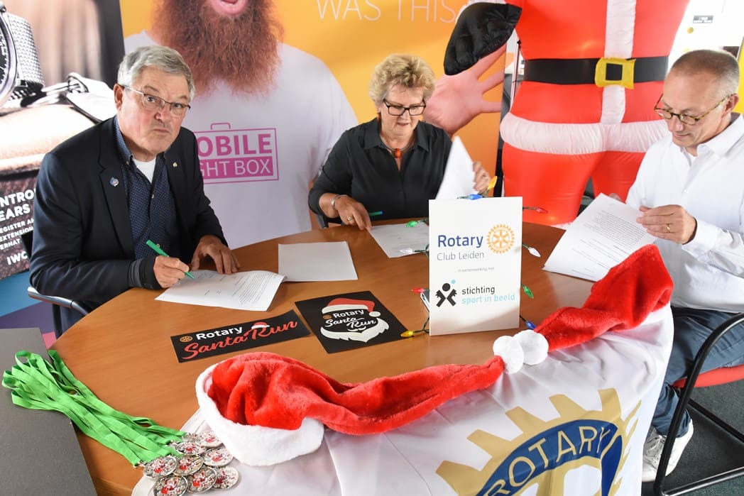 Het was dan ook een geweldig gezicht al die kerstmannen/vrouwen die door Leiden liepen en overal onderweg verrassingen tegenkwamen zoals muziek en andere acts maar ook liepen ze dwars door bijvoorbeeld de firma Hoppezak of museum Boerhaave.De organisatie wordt een steeds omvangrijkere klus, vandaar dat de Rotary Club gaat samenwerken met de Leidse Stichting Sport in Beeld. Vrijdagmiddag werden de handtekeningen onder het samenwerkingscontract gezet.Rotary Club Leiden voorzitter Jos van den Broek, tekende namens de Rotary en Jeroen Weijermars namens Stichting Sport in Beeld. Evenementen als de Santa Run gaan vallen onder de onlangs opgerichte Stichting Rotary Leiden Helpt, waarvan Rotarylid Anita Mantel voorzitter is.