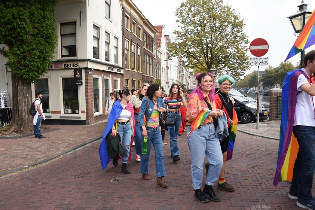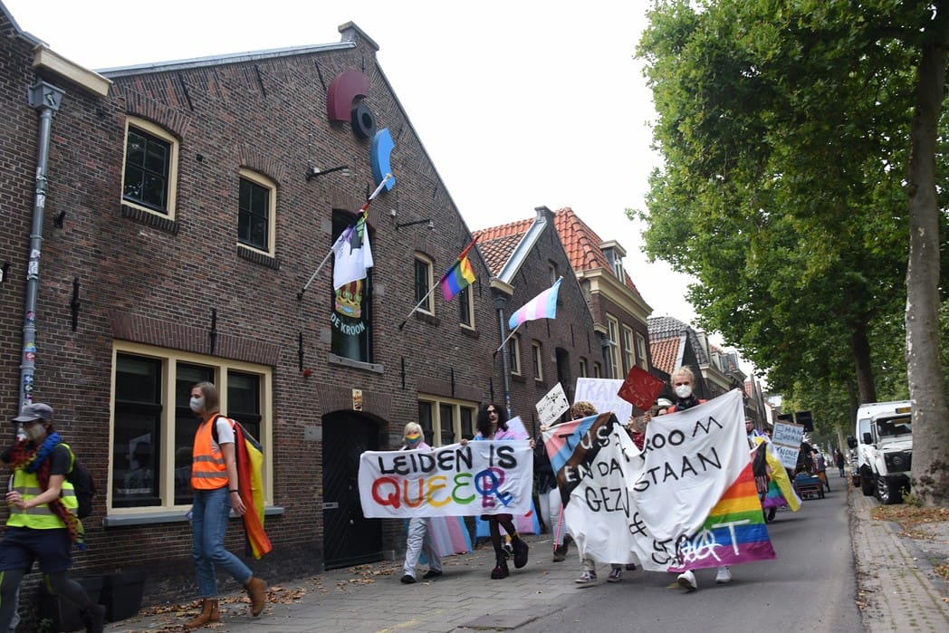 De Pride liep via de Langegracht langs De Kroon, het pand van het COC Leiden.