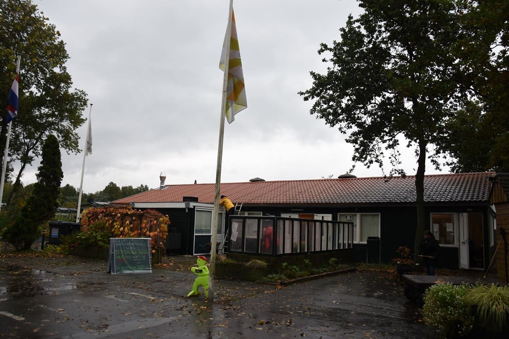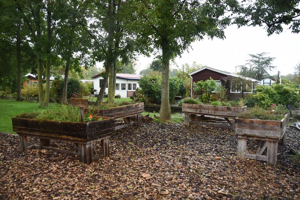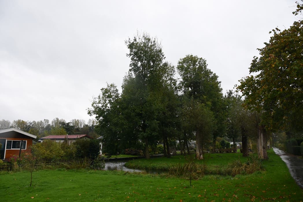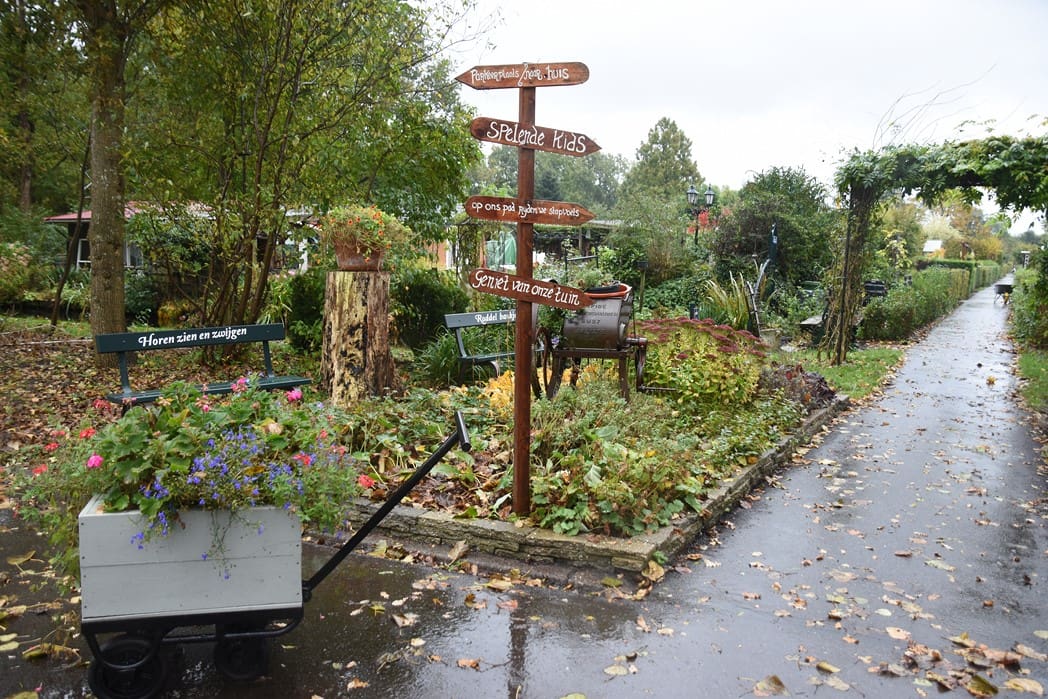 Ondanks de stromende regen liepen Karin en ik een rondje over het park.  Er zijn 308 tuinen op het park die alle huurders zelf onderhouden, daarnaast zijn er ruim zeventig vrijwilligers om het totale park mooi  te houden. Er is een speciale bouwcommissie, tuinadviseurs en natuurlijk vrijwilligers in de kantine en de patatterie.