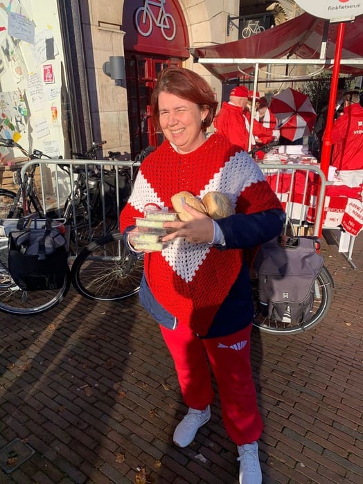 Op de foto is te zien dat Jolanda net in de Waag Haring & Wittebrood heeft gehaald. Het blauw van haar jack kwam heel goed uit. Leiden is natuurlijk rood-wit, maar de haring is toch ook onze nationale trots en dan komt het rood-wit-blauw heel goed uit.