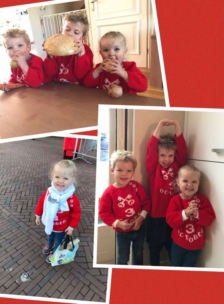 De eerste stop was op de Rijndijk. Samira stuurde deze foto in van haar drie kinderen in prachtige door zelf gebreide 3 Oktobertruien.