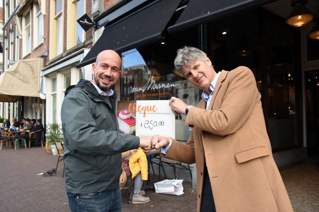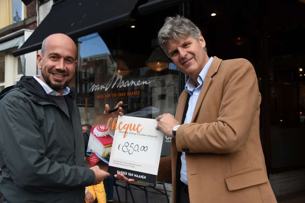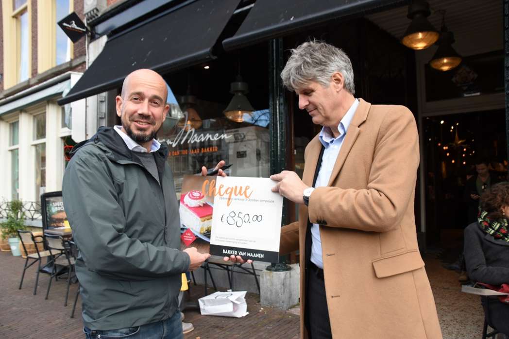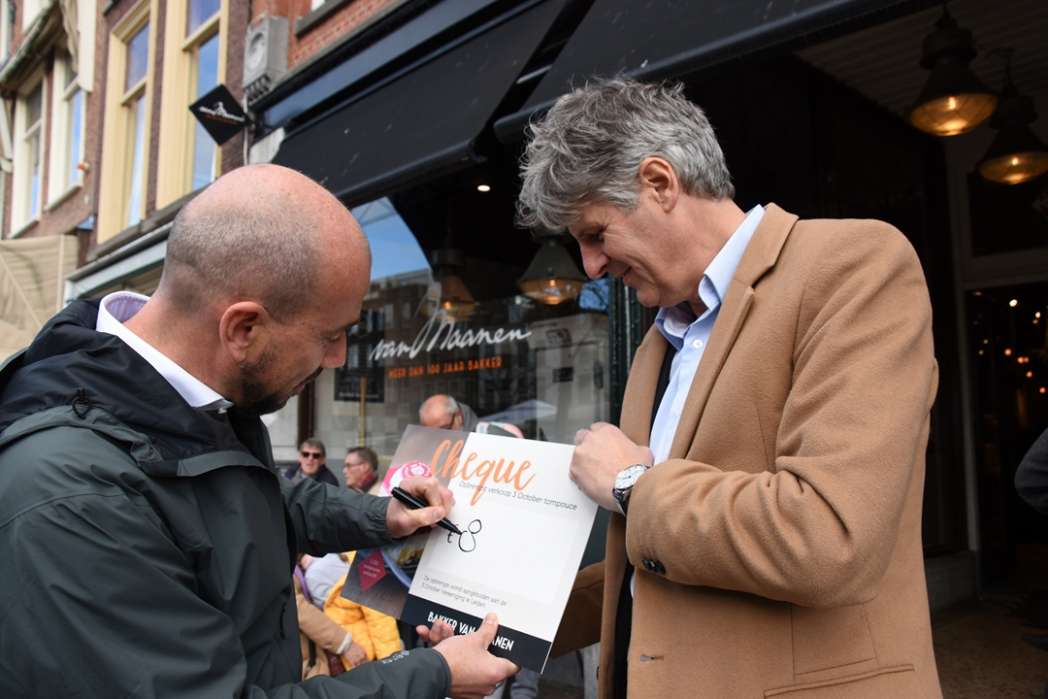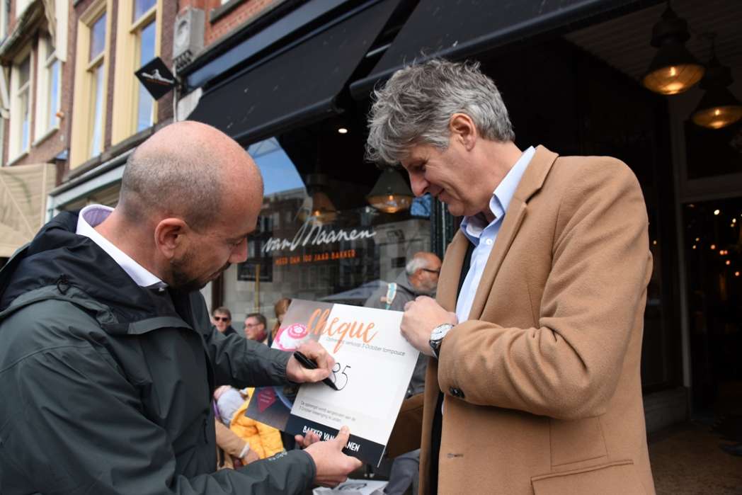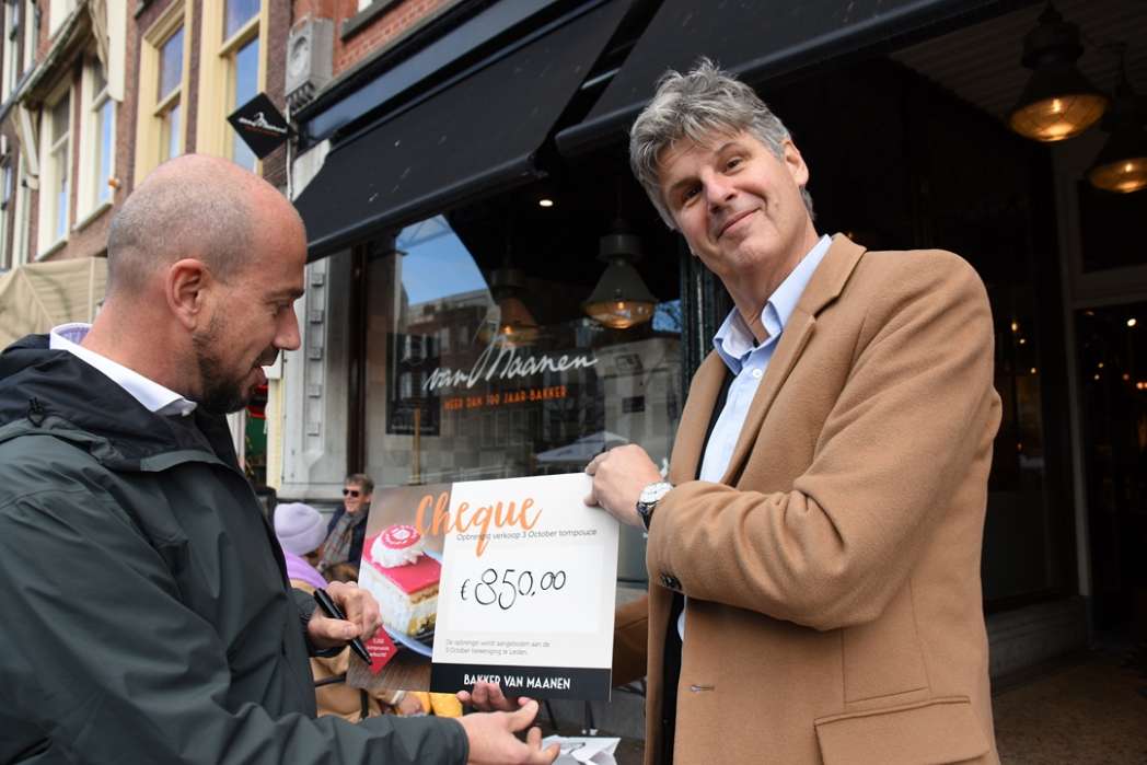 Voorzitter Rik Kamps was naar de winkel op de Nieuwe Rijn gekomen om de cheque in ontvangst te nemen. Hij had nog geen idee wat de opbrengst was.