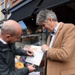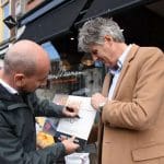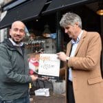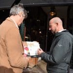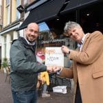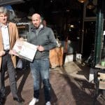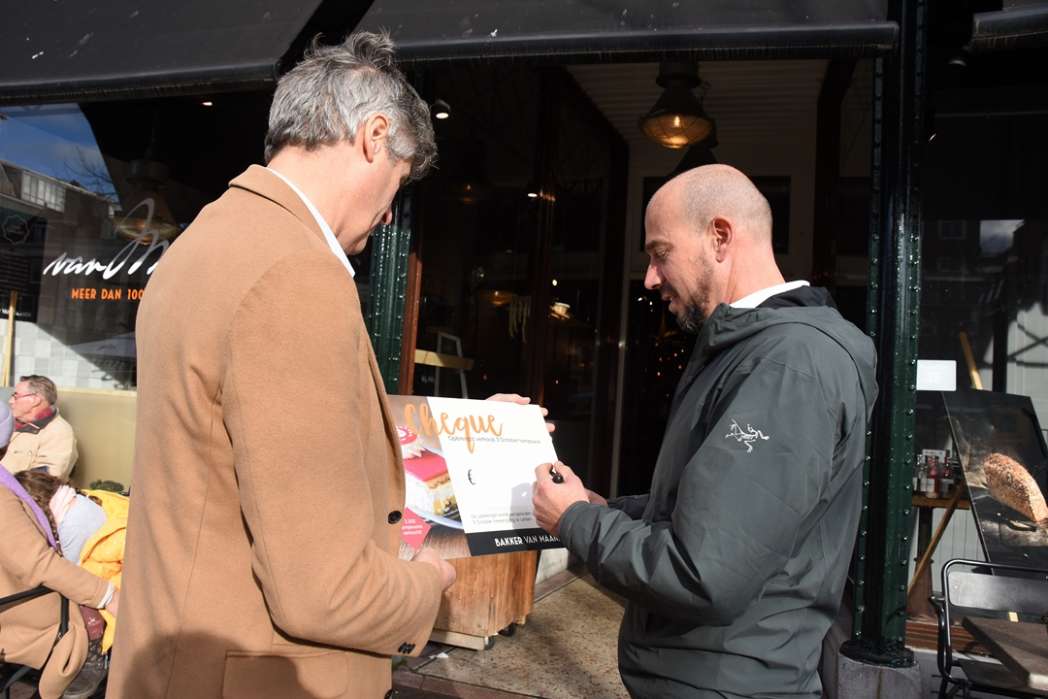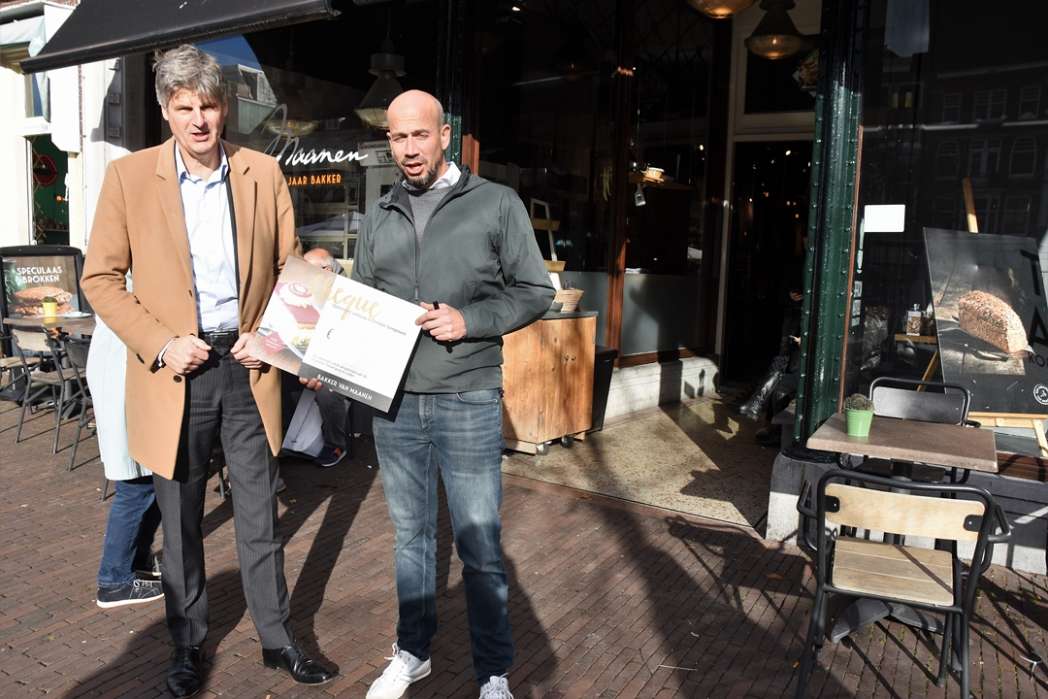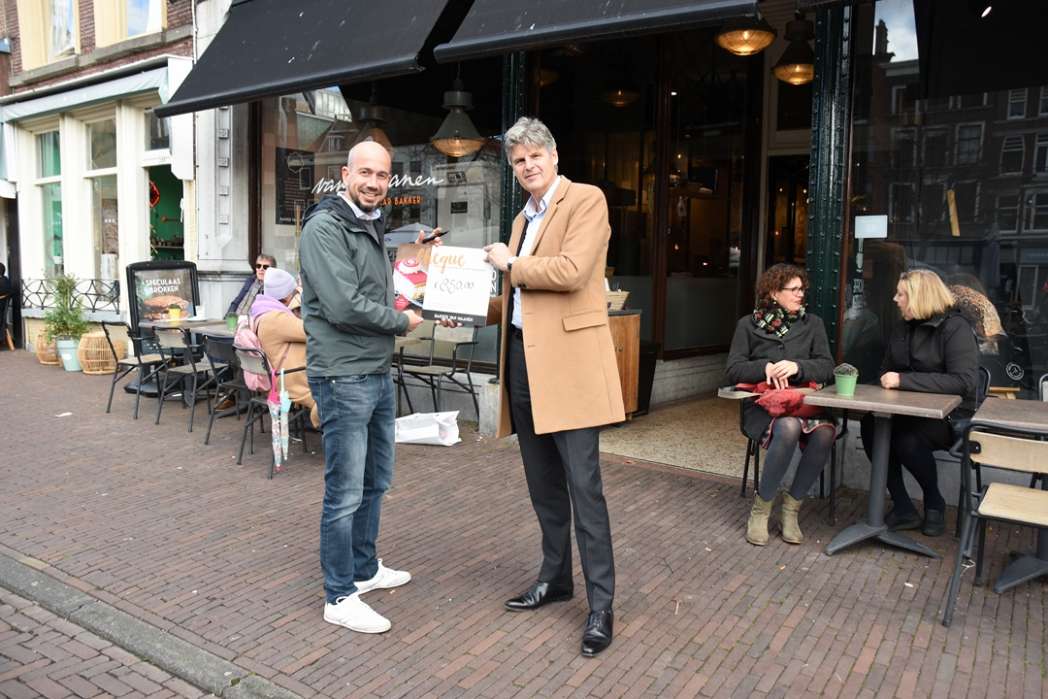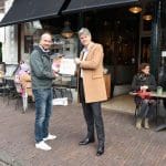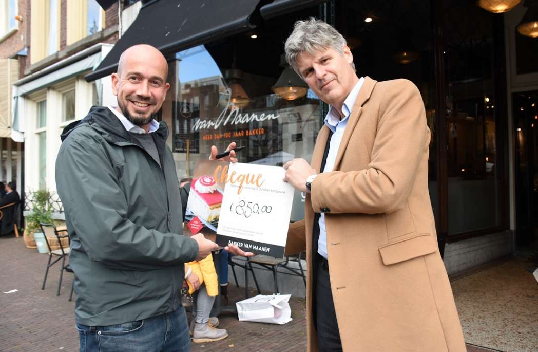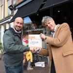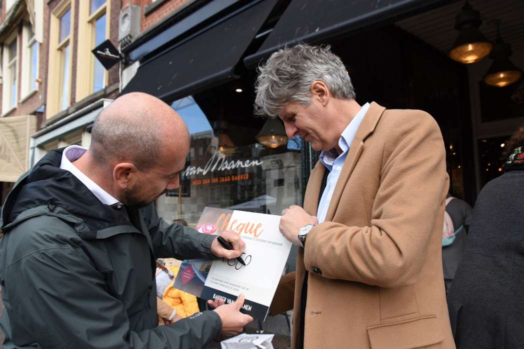 Voorzitter Rik Kamps was naar de winkel op de Nieuwe Rijn gekomen om de cheque in ontvangst te nemen. Hij had nog geen idee wat de opbrengst was.