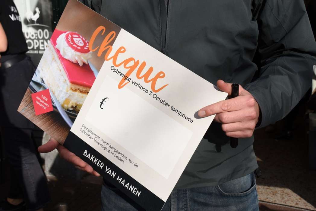 Elke Leidenaar kent de Geusjes, de broodjes die we elk jaar bij de uitreiking van Haring & Wittebrood krijgen. Sinds 2004 worden de circa 15.000 Geusjes gebakken door bakkerij van Maanen. Dit jaar had Johan van Maanen een leuk idee, hij bedacht de 3 October Tompouce. We hebben met Koningsdag de oranje tompouce, waarom dan met 3 October geen rood-witte tompouce met de Leidse Sleutels erop. Maar hij had nog een tweede leuk idee, van elke verkochte tompouce ging er 25 eurocent naar de 3 October Vereeniging. Vanmiddag maakte Johan van Maanen bekend welk bedrag er overgemaakt wordt naar de 3 October Vereeniging.