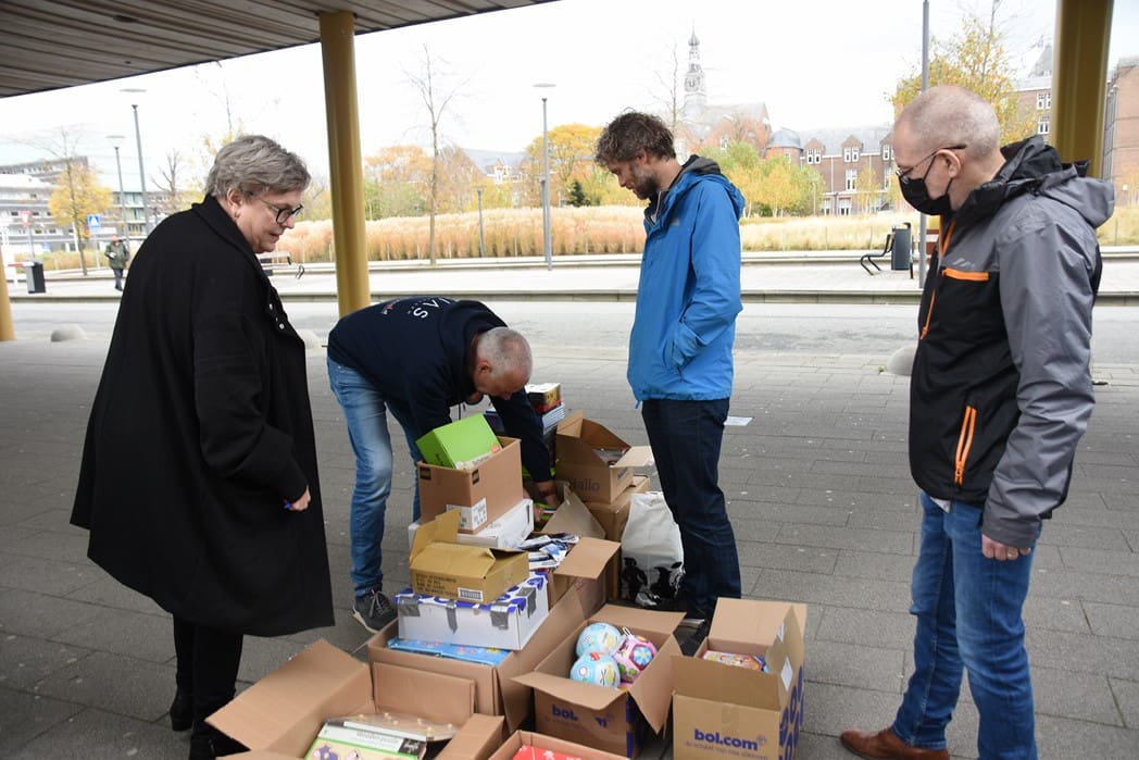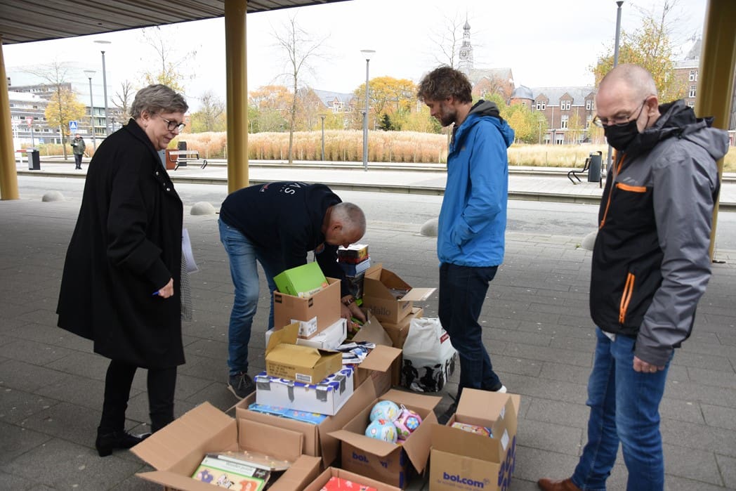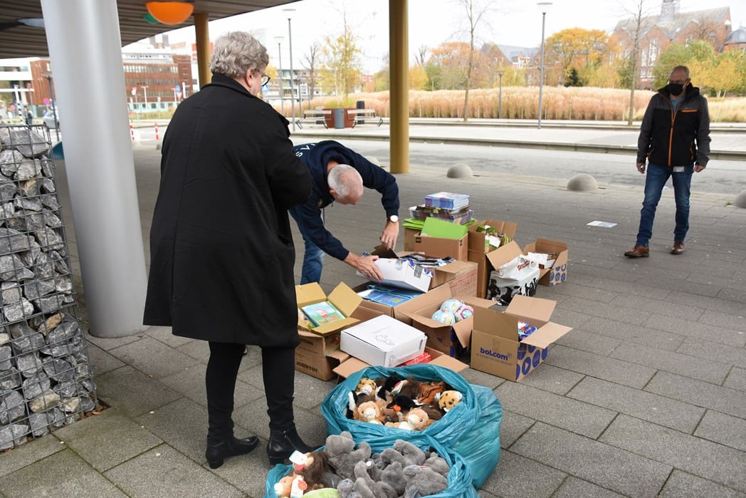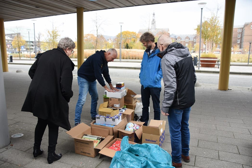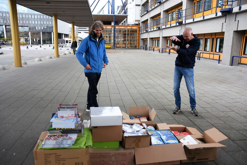 Het waren zoveel cadeautjes dat Bianca haar man Dick ook maar even kwam helpen om alles in rolcontainers te stapelen.