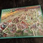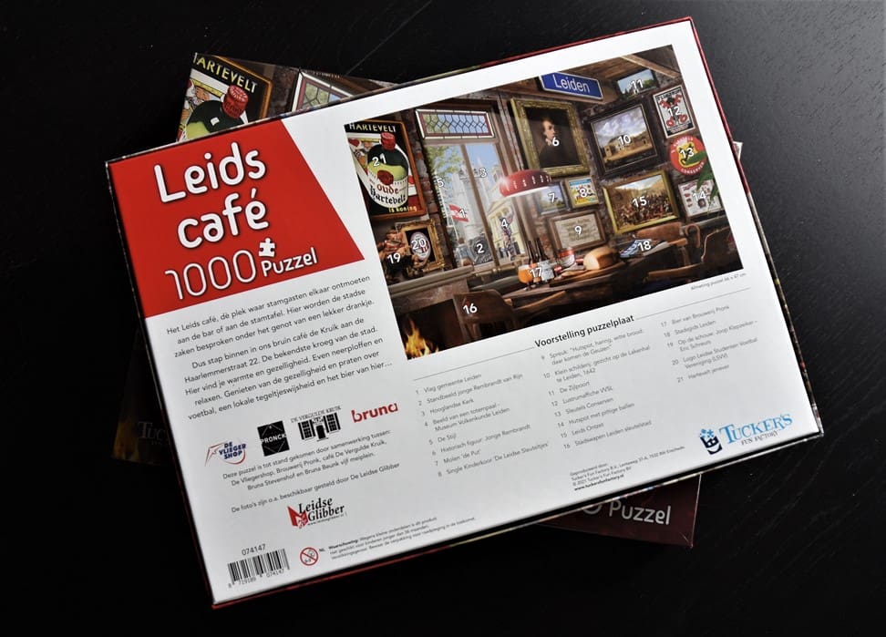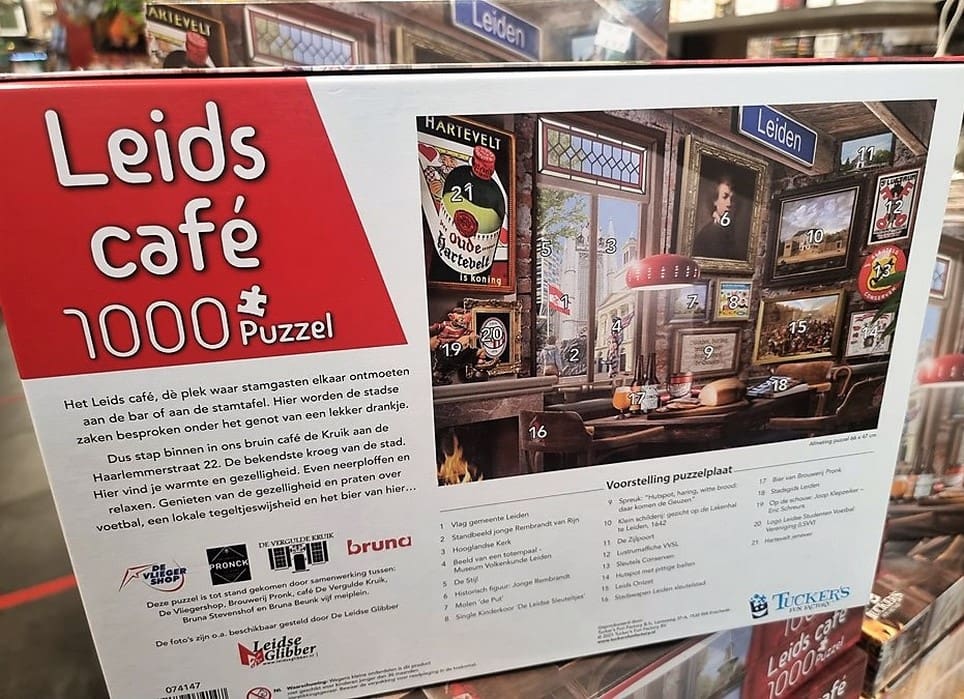 Op de puzzel staan afbeeldingen van bekende Leidse plekken. Als de puzzel af is lijkt het of je vanuit een caféraam de stad inkijkt en al die mooie plekken ziet.