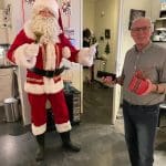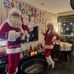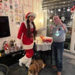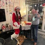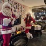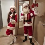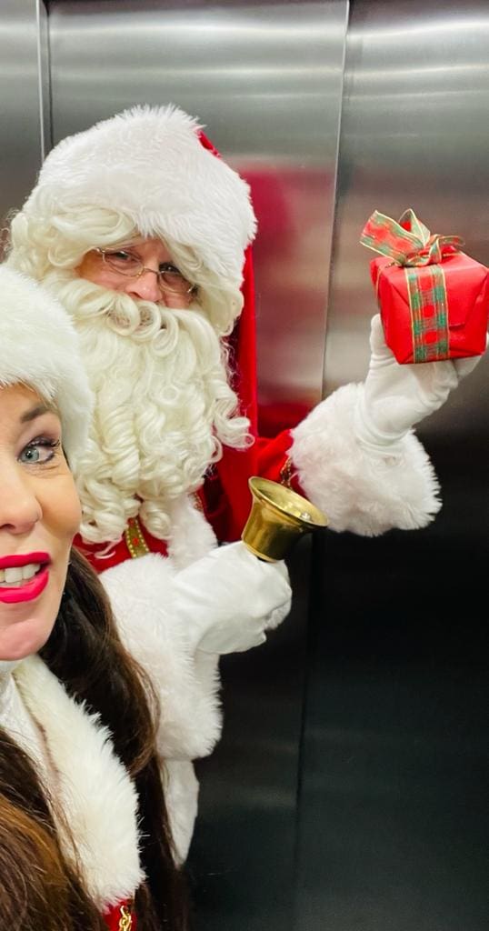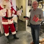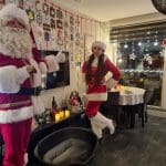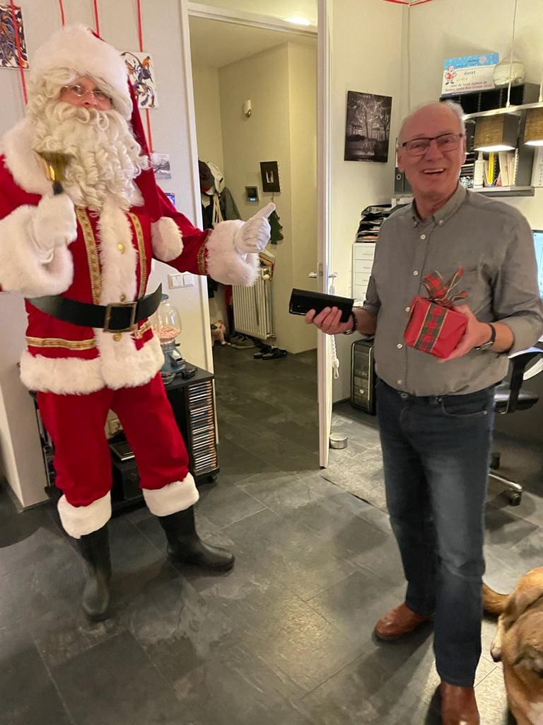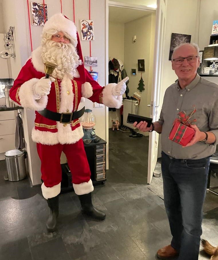 Je boft met de kerstman en vrouw voor de deur, die zelf binnen komen.