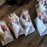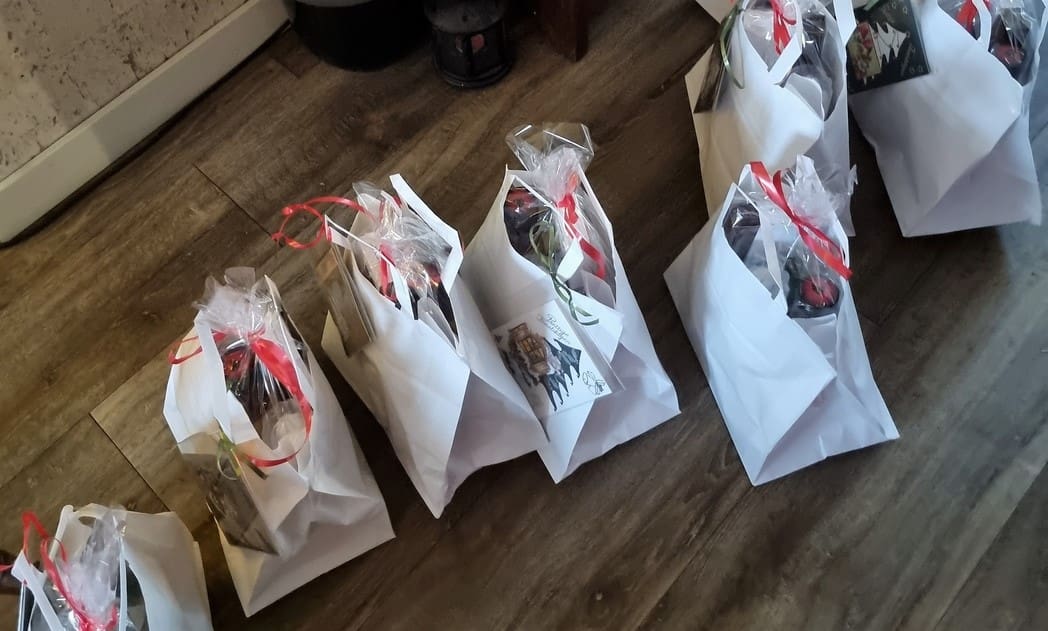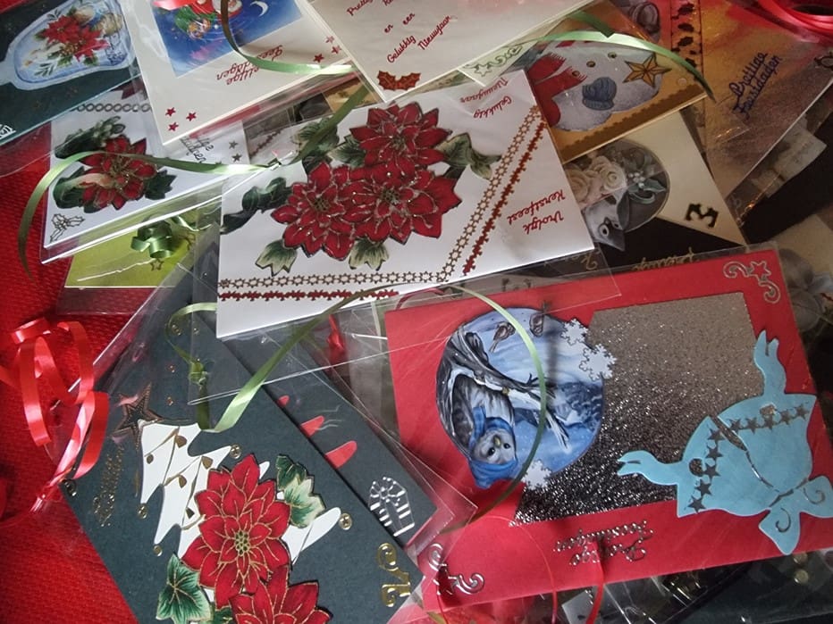 Aan elk pakket werd een door Rina Ouwerkerk handgemaakte kaart gehangen.