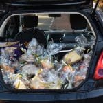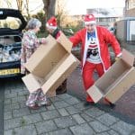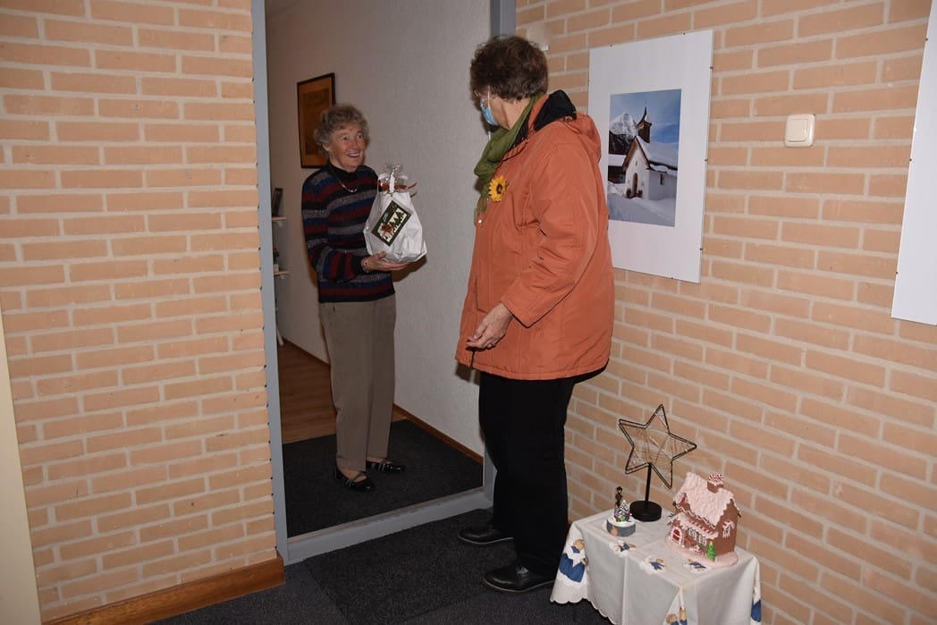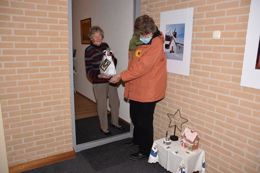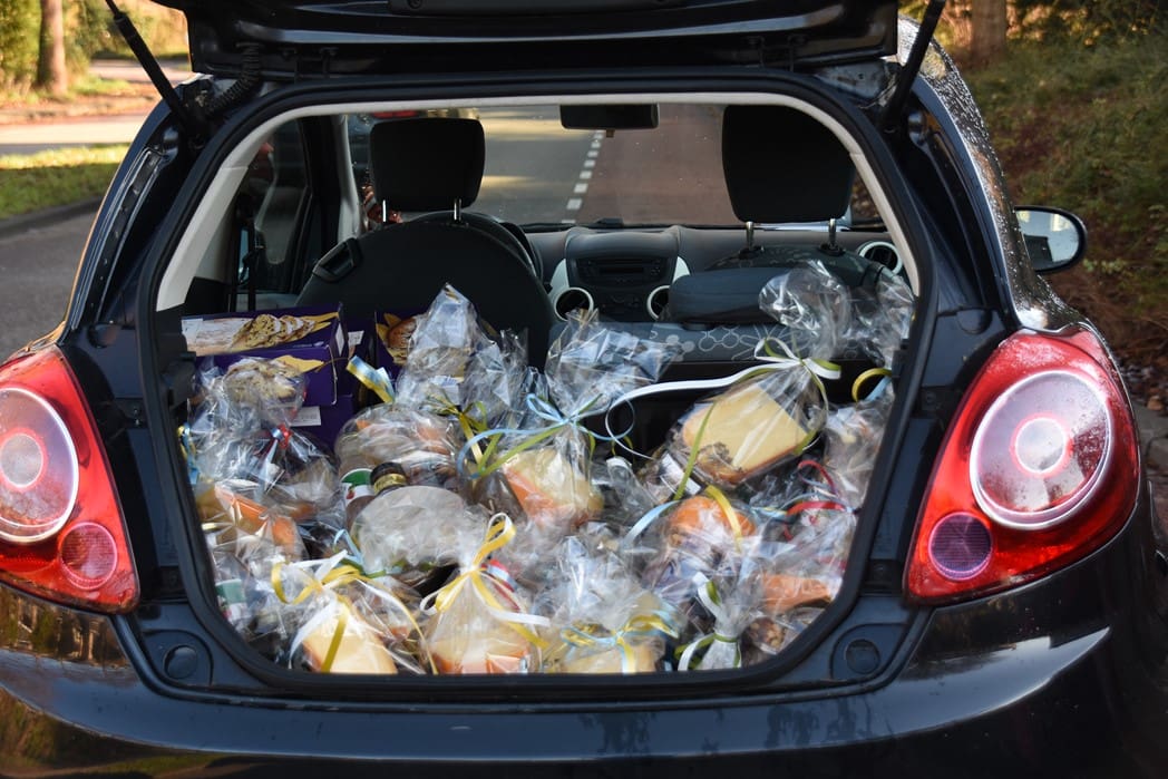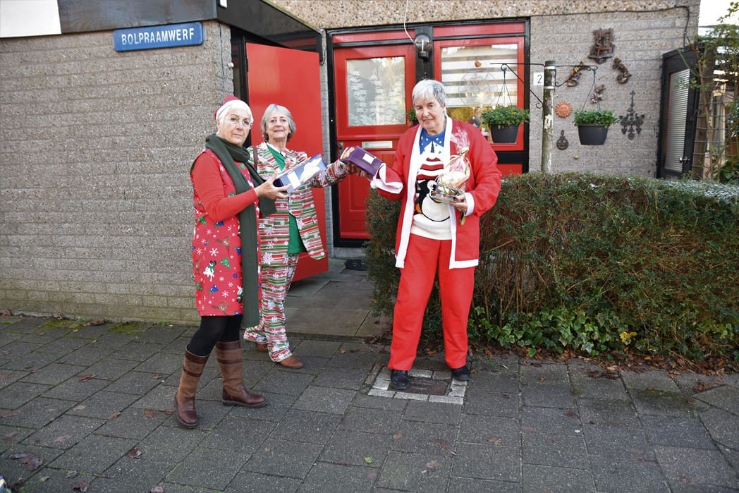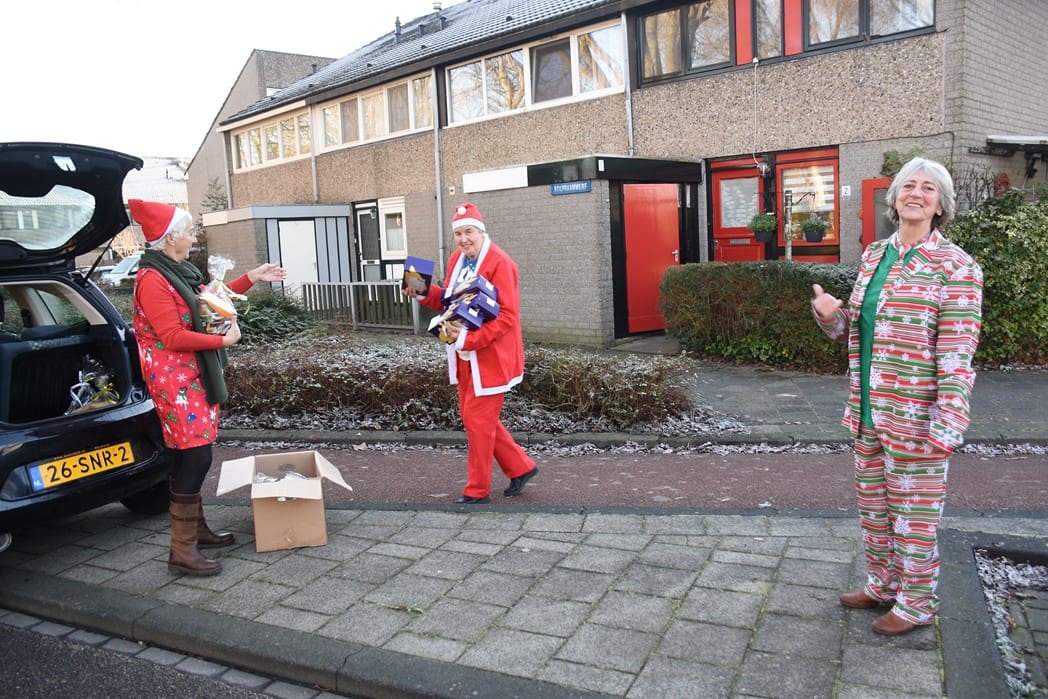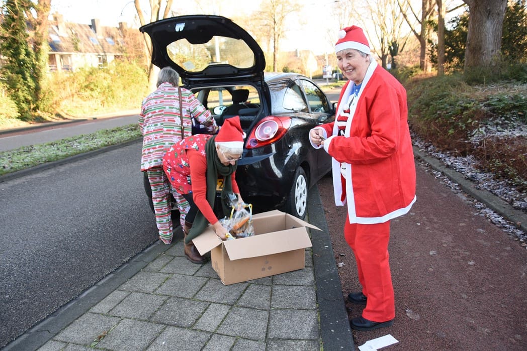 Hier hetzelfde verhaal in verband met corona geen gezellige bijeenkomst voor ouderen, maar waren Joke van den Berg, Lies Kriek en Sophia van Tongeren druk bezig de kofferbak van de auto vol te laden met pakketten om langs te gaan brengen.