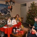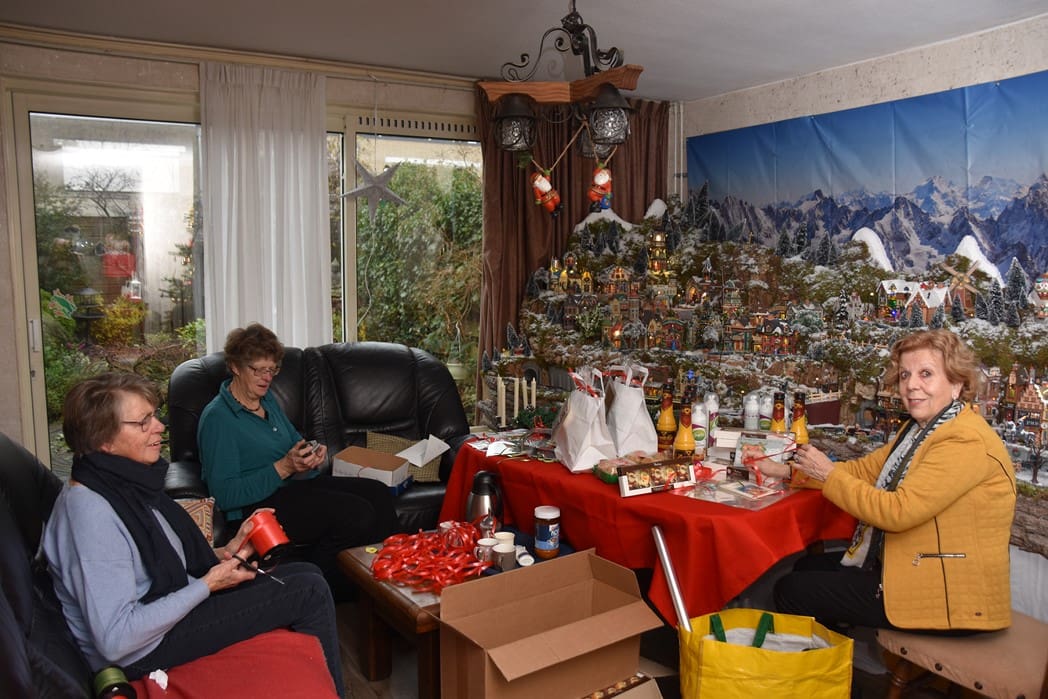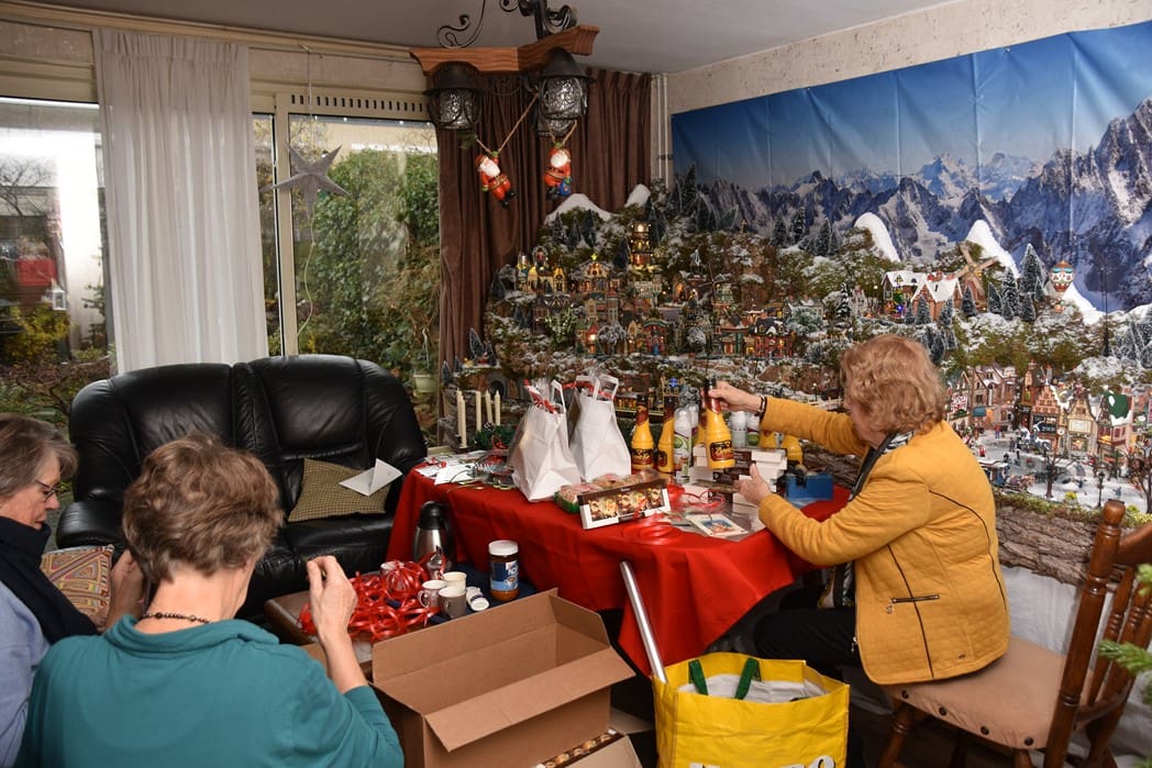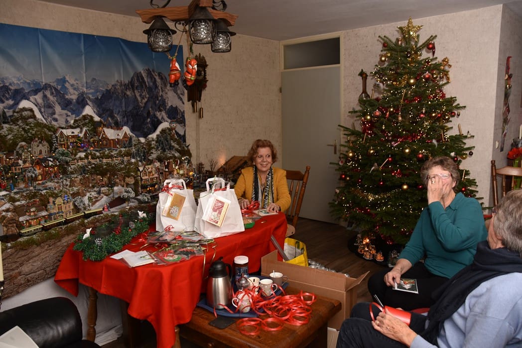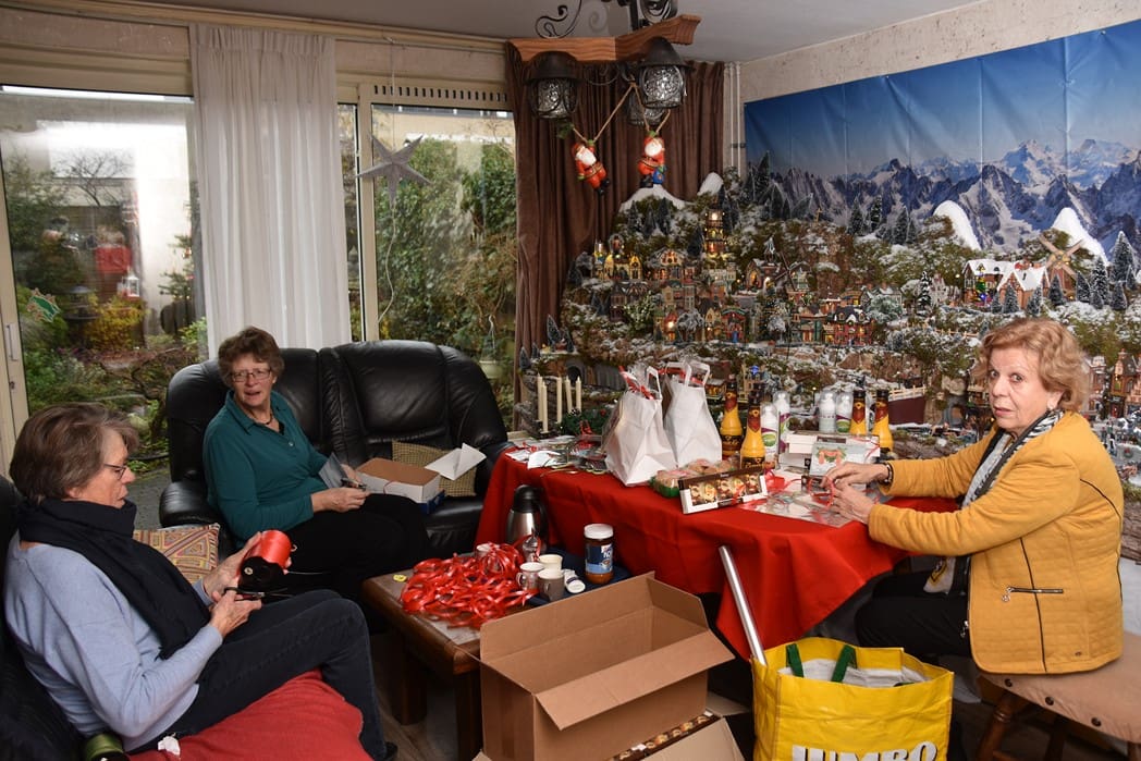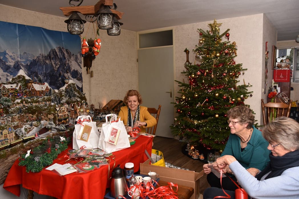 In de kamer waren Rina Ouwerkerk, Nel Hoogeveen en Rika Zitman druk bezig 85 kerstpakketten in te pakken.