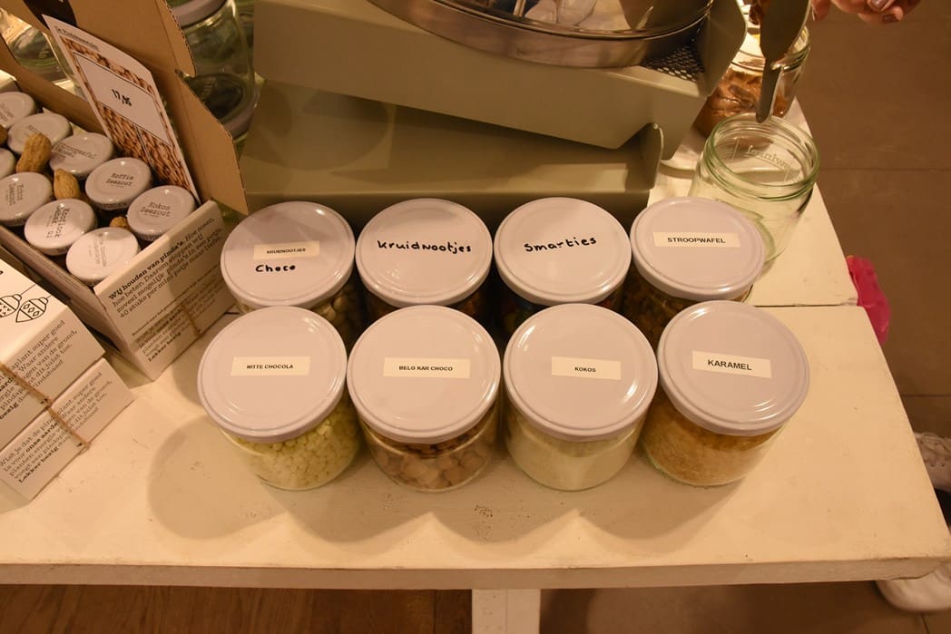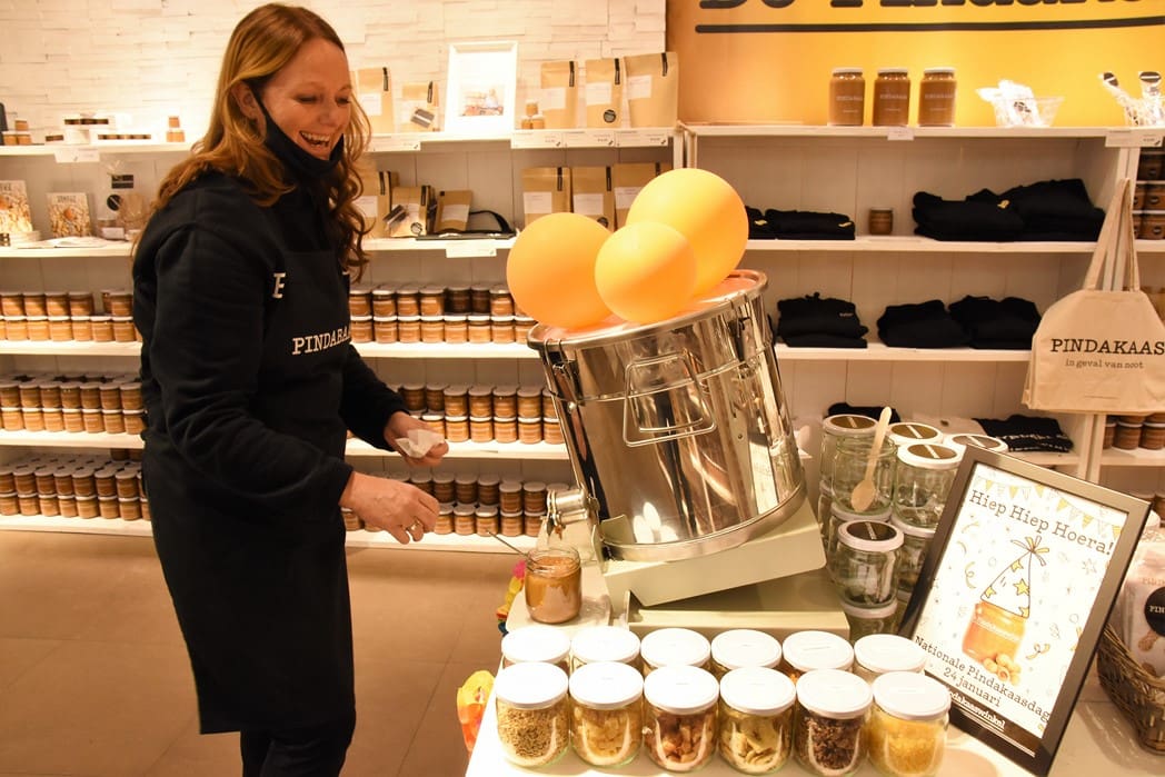 Maar nu over de Nationale Pindakaasdag op 24 januari. Om dat te vieren is het eigenlijk de hele week feest in de winkel en kan iedereen zijn eigen smaak samenstellen. Dat kan zoet zijn met bijvoorbeeld witte chocola, smarties, kokos of caramel.