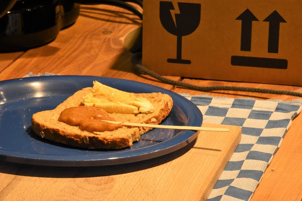Ik koos voor chilipeper, gebakken ui, nasi en seroendeng als topping op mijn eigen potje pindakaas.