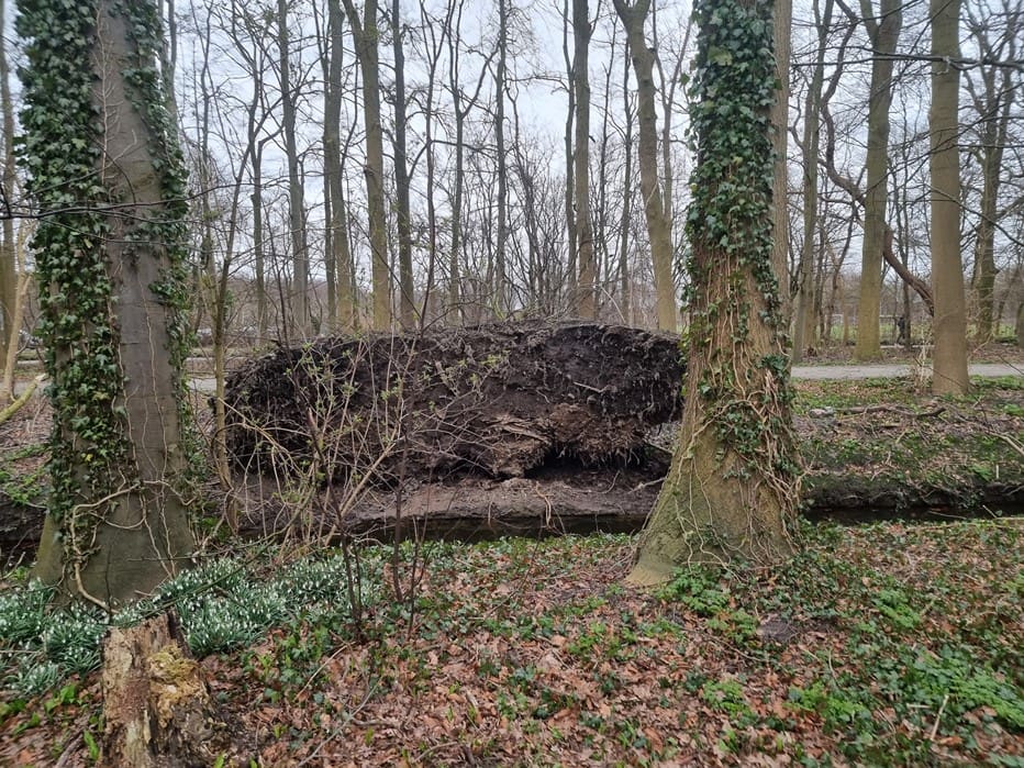 Klopt , als er ( in deze tijd van het jaar) bomen omgaan is dat vaak een kwestie van achterstallig onderhoud want er zit niets in het blad. En zo’n pannenkoek wortelstelsel vraagt natuurlijk om moeilijkheden als de wind van de verkeerde kant komt.