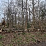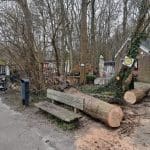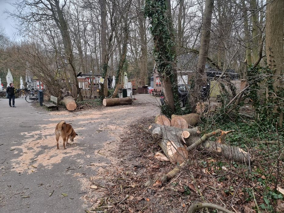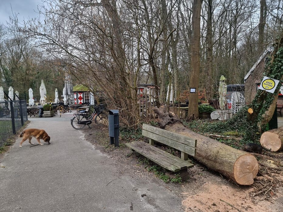 Op het terrein van het Theehuis was (en is nog steeds) het ook link geweest. Bernard heeft de gemeente al meerdere keren gevraagd de dode bomen om te zagen, omdat het bij een beetje wind dode takken regent tussen het kantoor en het terras. Gisteren heeft Eunice alvast geholpen wat ruimte te maken en een grote boom op de hoek weggehaald.