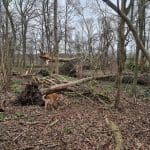 Meerdere bomen waren ontworteld en omgevallen, over en door elkaar heen.