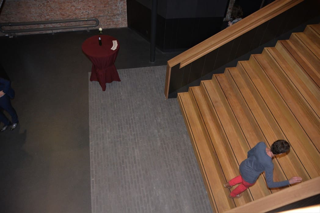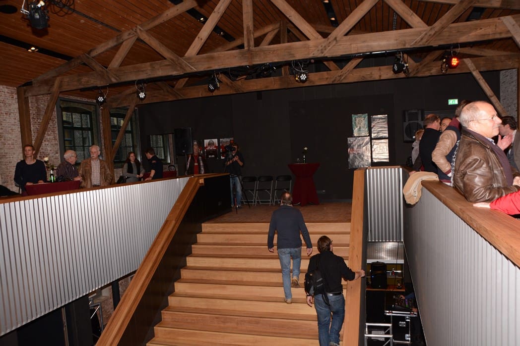 Op de plek waar nu de tafels staan stond eerst de grote trap.