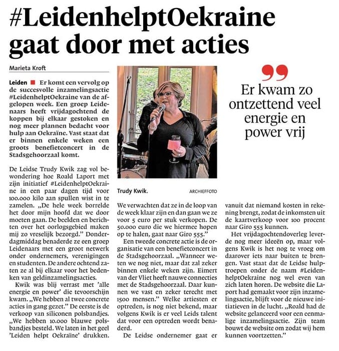 Momenteel wordt op de achtergrond de site aangepast en is vanaf komende week alle informatie over de komende acties te vinden op www.leidenhelptoekraïne.nl