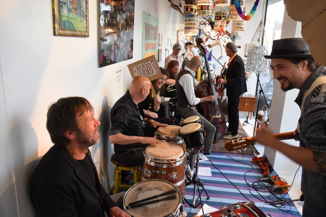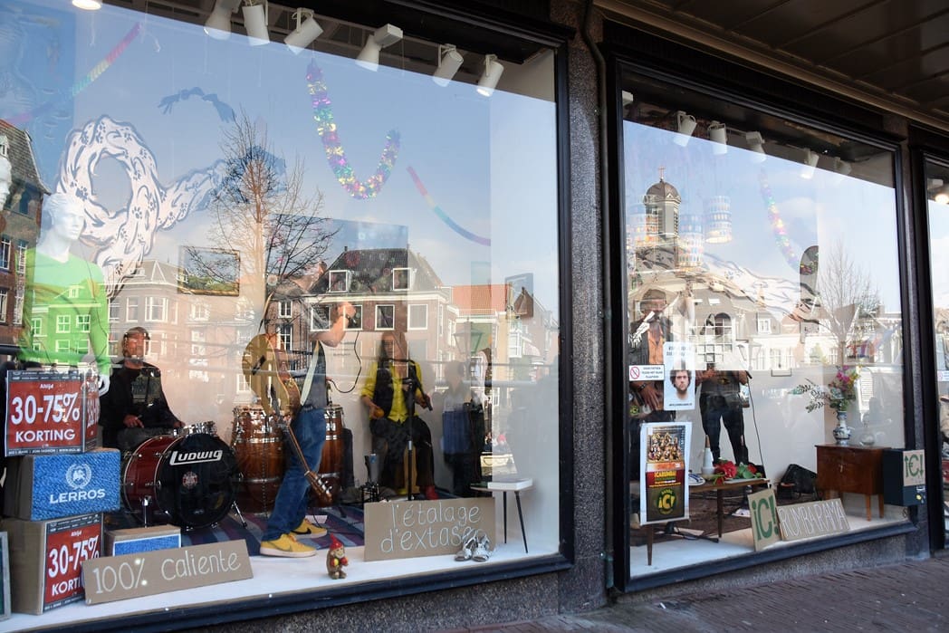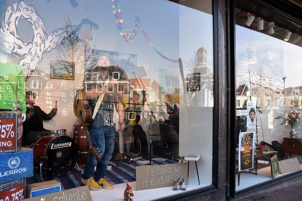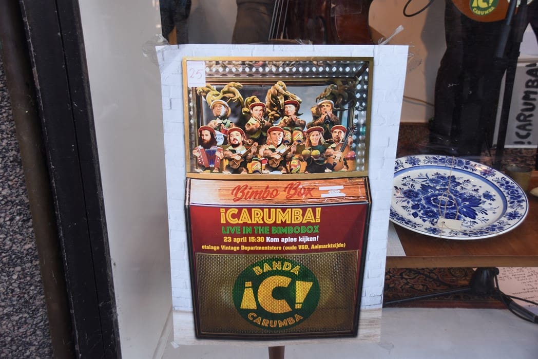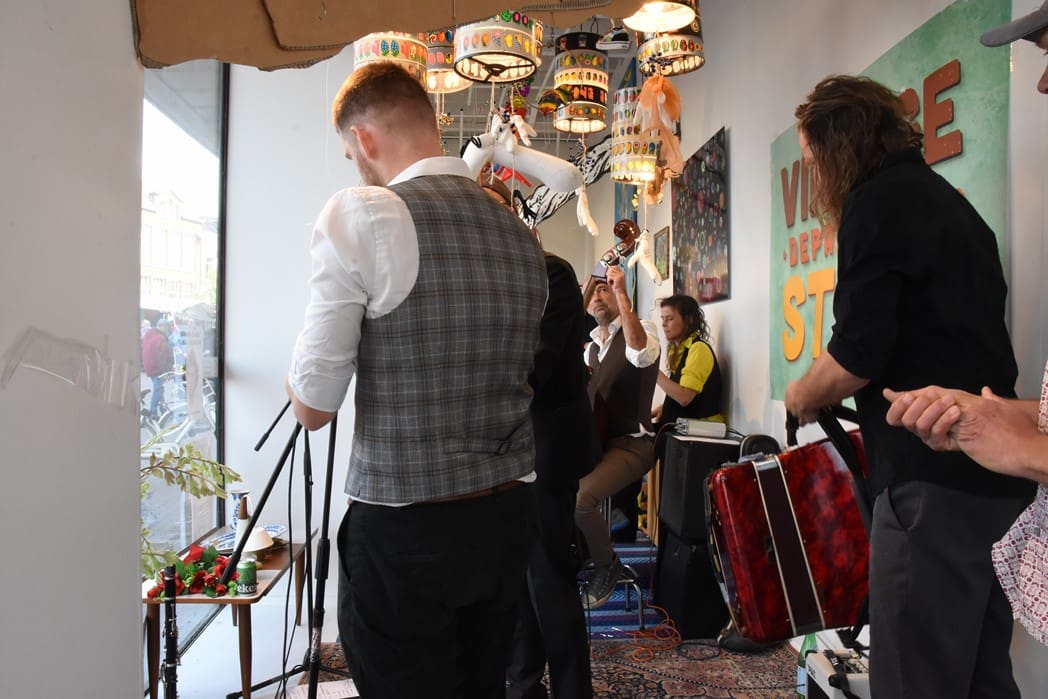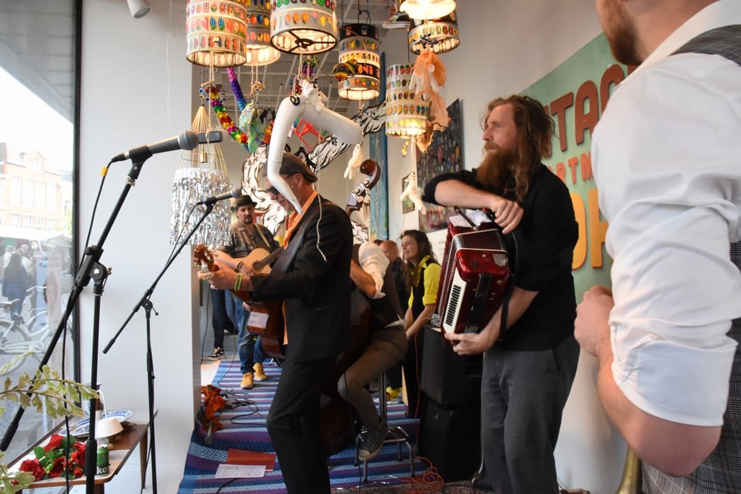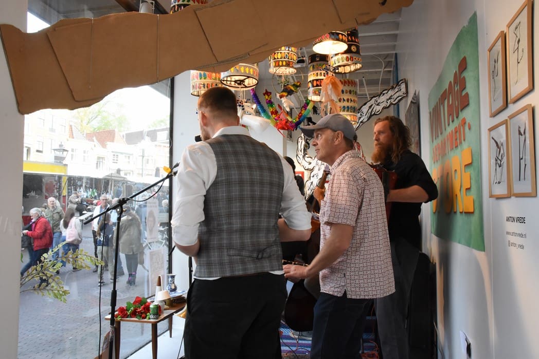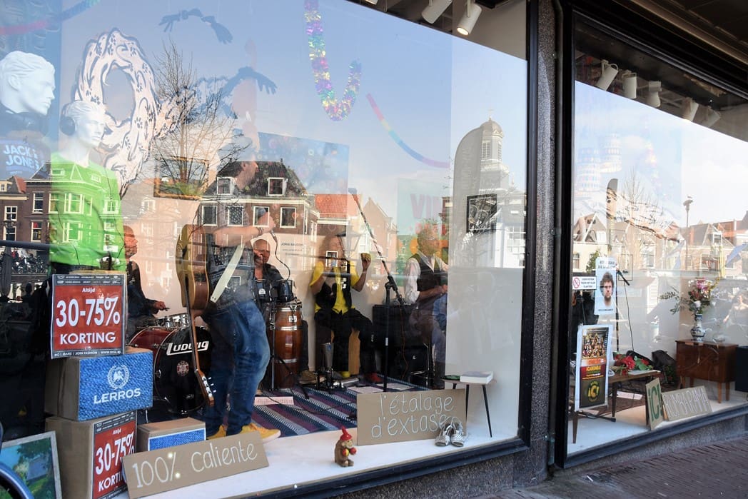 Het meest origineel gevonden vond ik de levende Bimbo Box in de etalage van de Vintage Department Store, het vroegere V&D. Het winkelend publiek keek al wat vreemd op waarom er muziekinstrumenten in de etalage stonden.