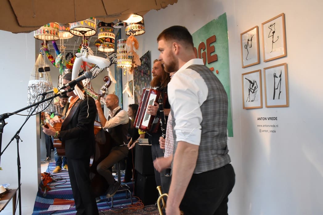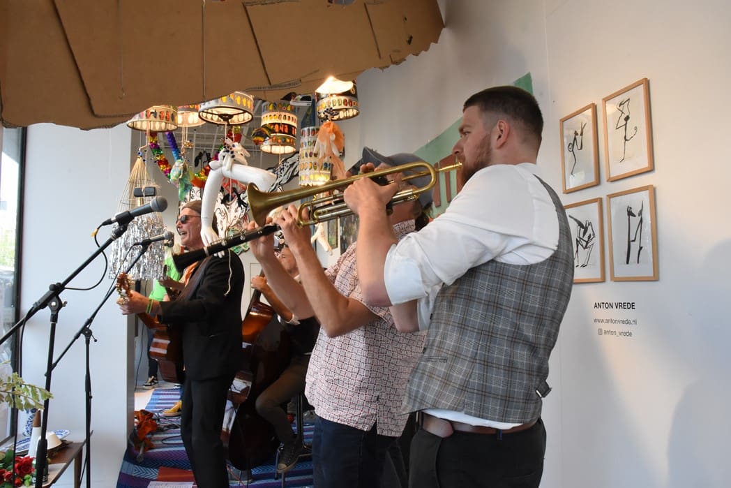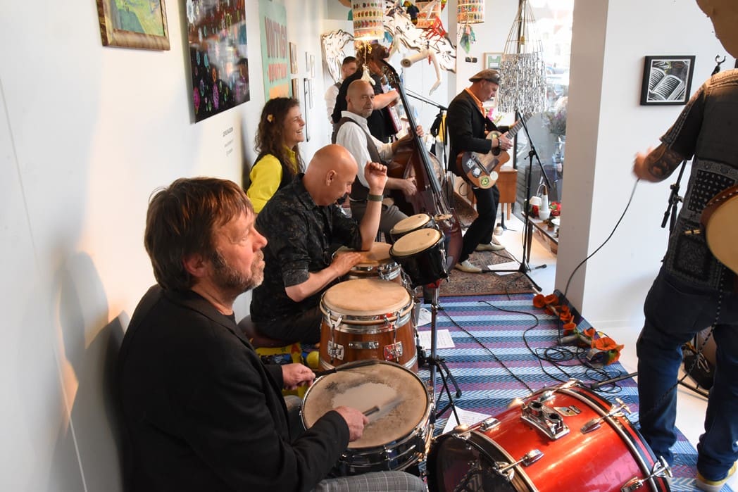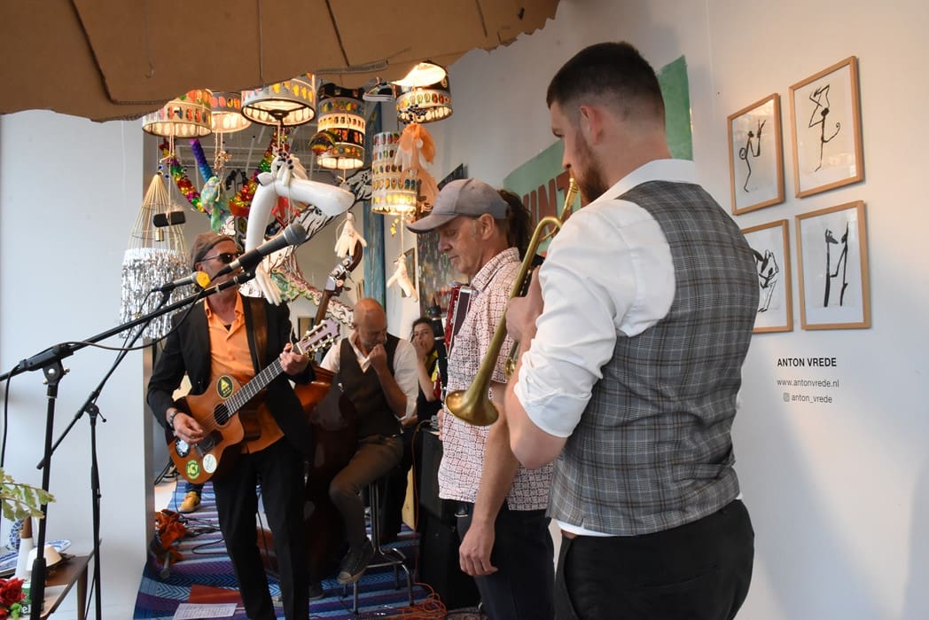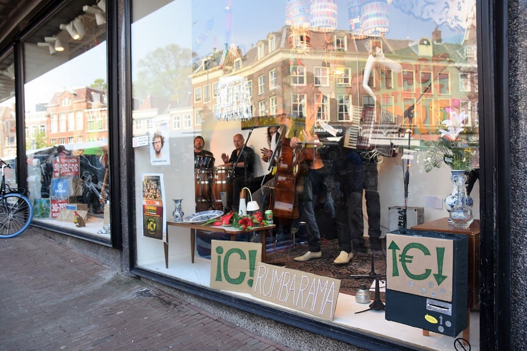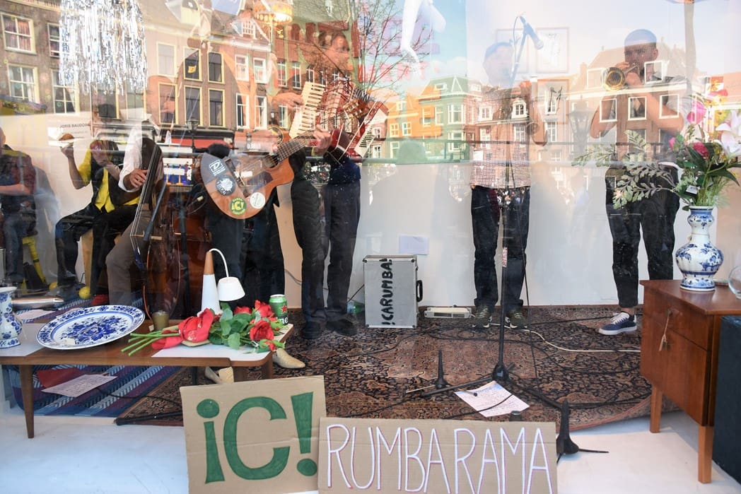 Om half vier stapten de leden van Banda Carumba de etalage binnen om een concert te gaan geven.