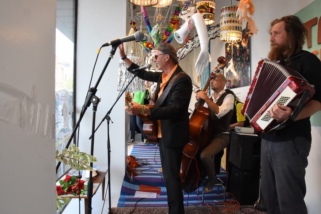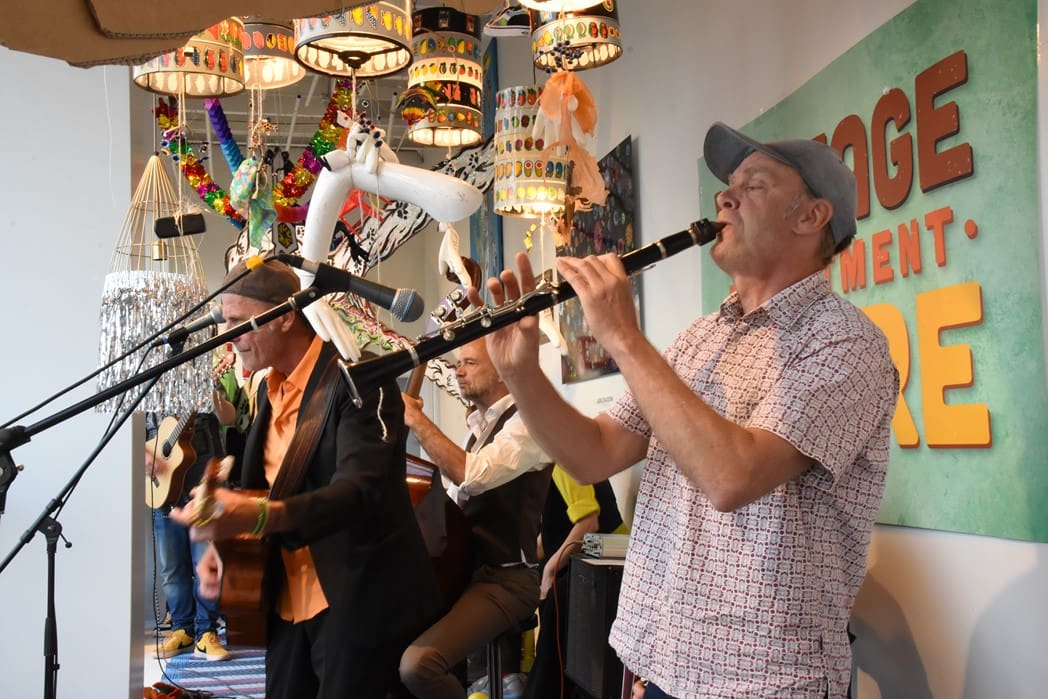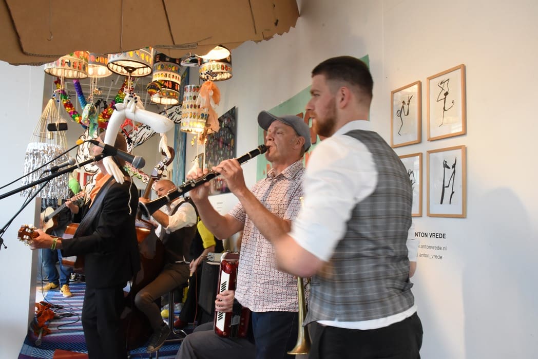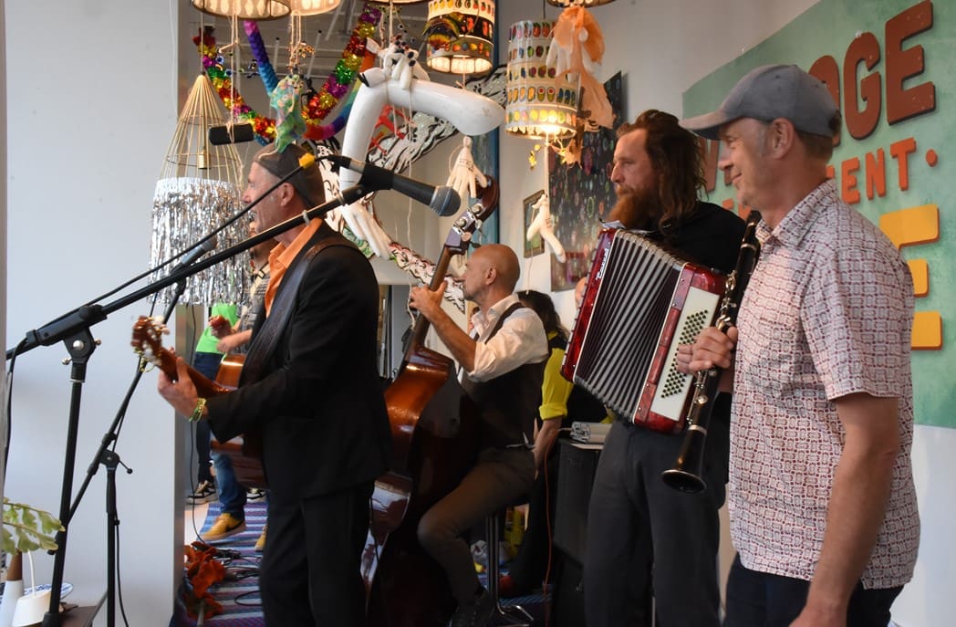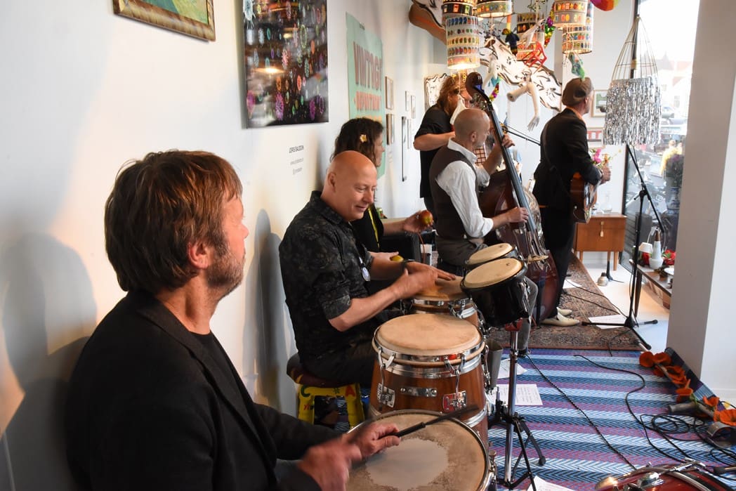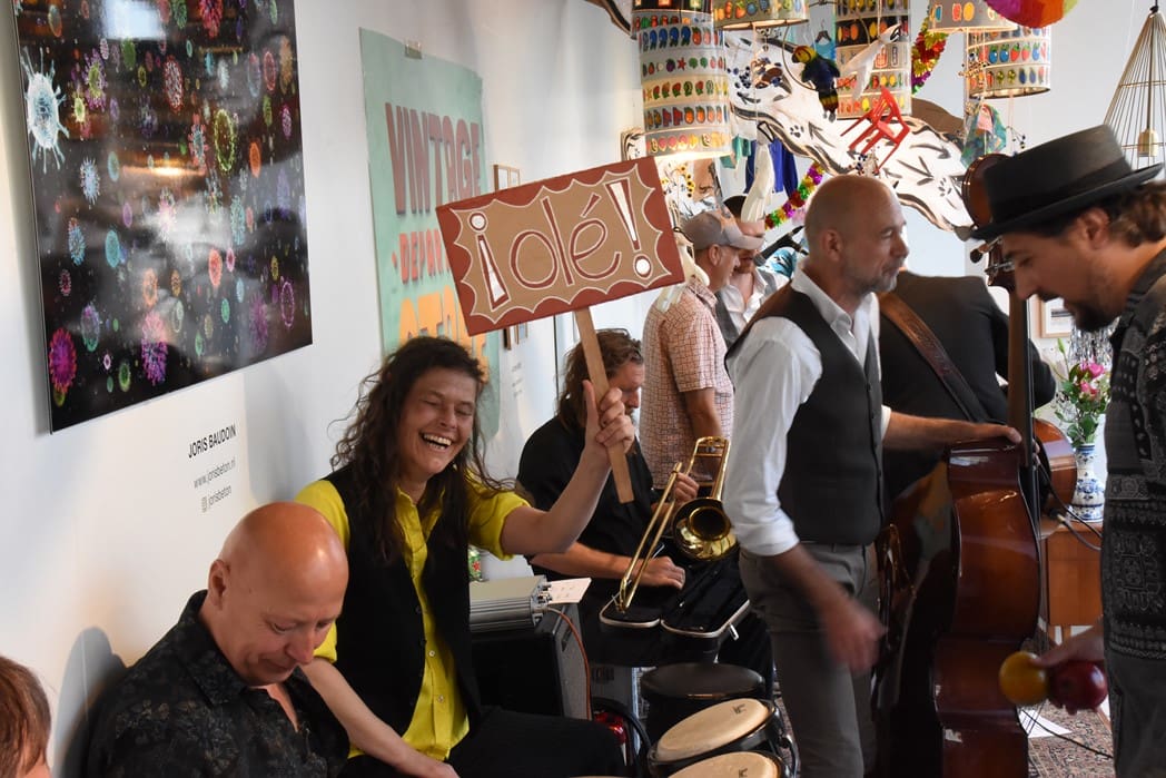 Om half vier stapten de leden van Banda Carumba de etalage binnen om een concert te gaan geven.