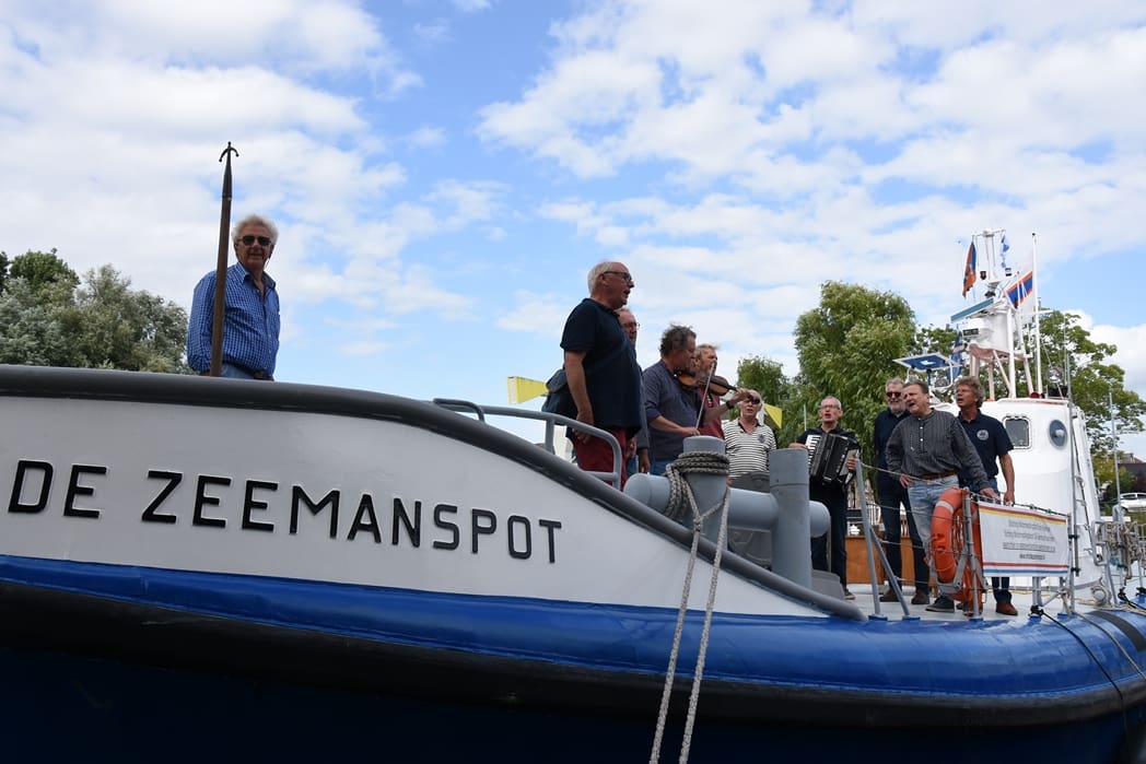Een zeemanskoor hoort natuurlijk eigenlijk op een schip vond de schipper van de Zeemanspot en nodigde het koor uit aan boord te komen zingen.